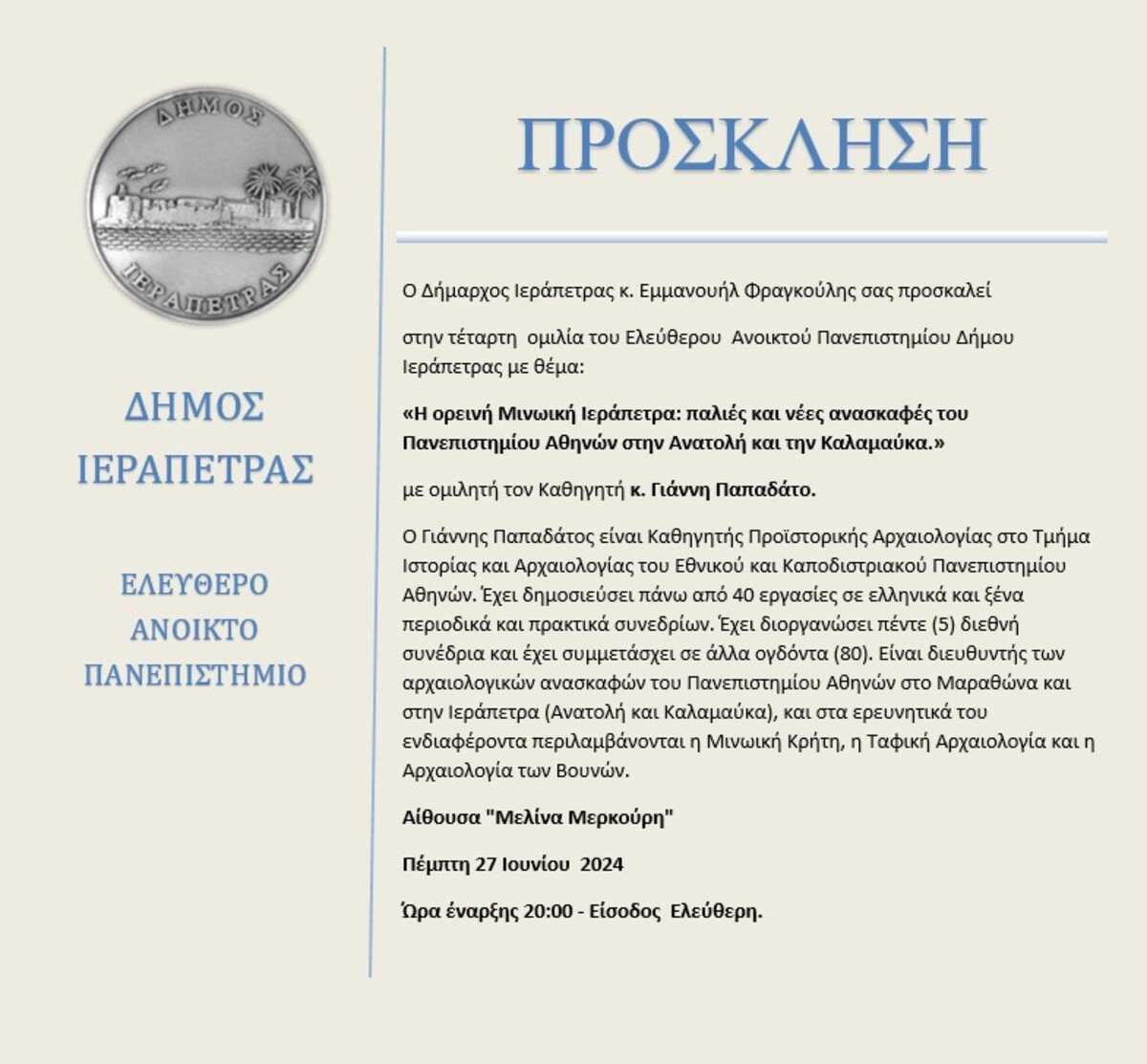 «Η ορεινή Μινωική Ιεράπετρα: παλιές και νέες ανασκαφές του Πανεπιστημίου Αθηνών στην Ανατολή και την Καλαμαύκα» με ομιλητή τον καθηγητή κ. Γιάννη Παπαδάτο.