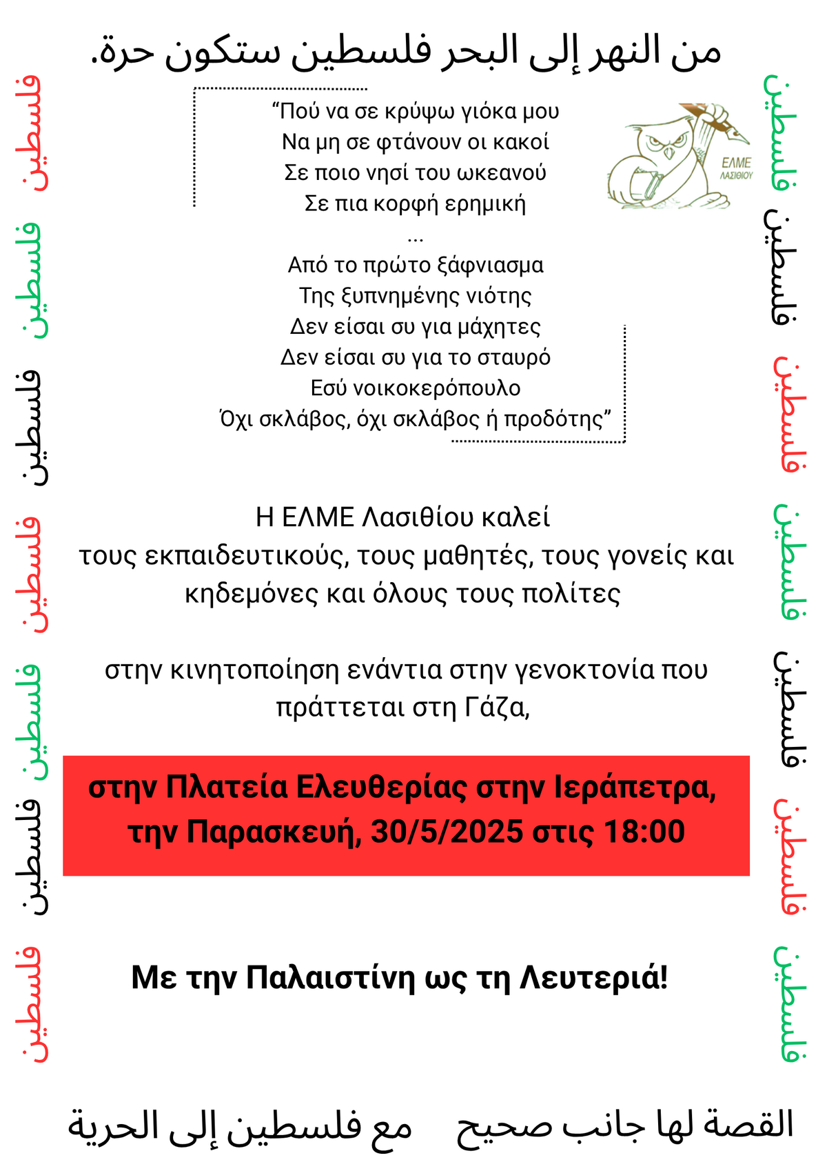 Η ΕΛΜΕ Λασιθίου καλεί τους εκπαιδευτικούς, τους μαθητές, τους γονείς και κηδεμόνες και όλους τους πολίτες στην κινητοποίηση ενάντια στην γενοκτονία που πράττεται στη Γάζα,