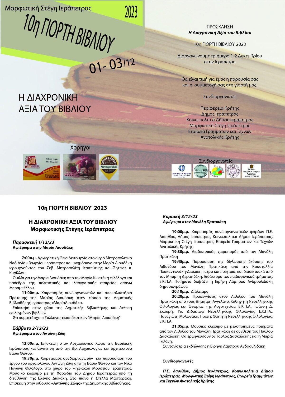 Η δεύτερη μέρα ήταν αφιερωμένη στον αρχαιολόγο Αντώνη Ζώη και η τρίτη στον ποιητή από το Μύρτος, Μανώλη Πρατικάκη. Συνδιοργανωτές ήταν η Περιφέρεια Κρήτης, ο Δήμος Ιεράπετρας και το ΝΠ ΚΟΙΝΩΠΟΛΙΤΙΑ και η Εταιρεία Γραμμάτων και Τεχνών Ανατολικής Κρήτης.