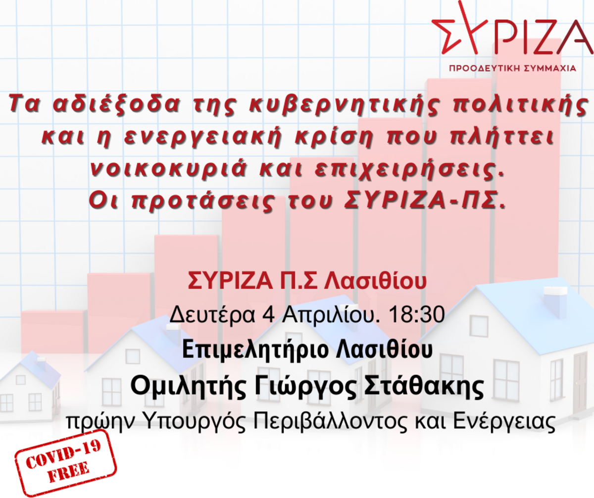 Ο πρώην Υπουργός Ενέργειας και Περιβάλλοντος Γιώργος Σταθάκης θα επισκεφθεί τον Άγιο Νικόλαο τη Δευτέρα 4/4/2022 και θα έχει συνάντηση με παραγωγικούς φορείς του νομού στο Επιμελητήριο Λασιθίου στις 12.00 το μεσημέρι.