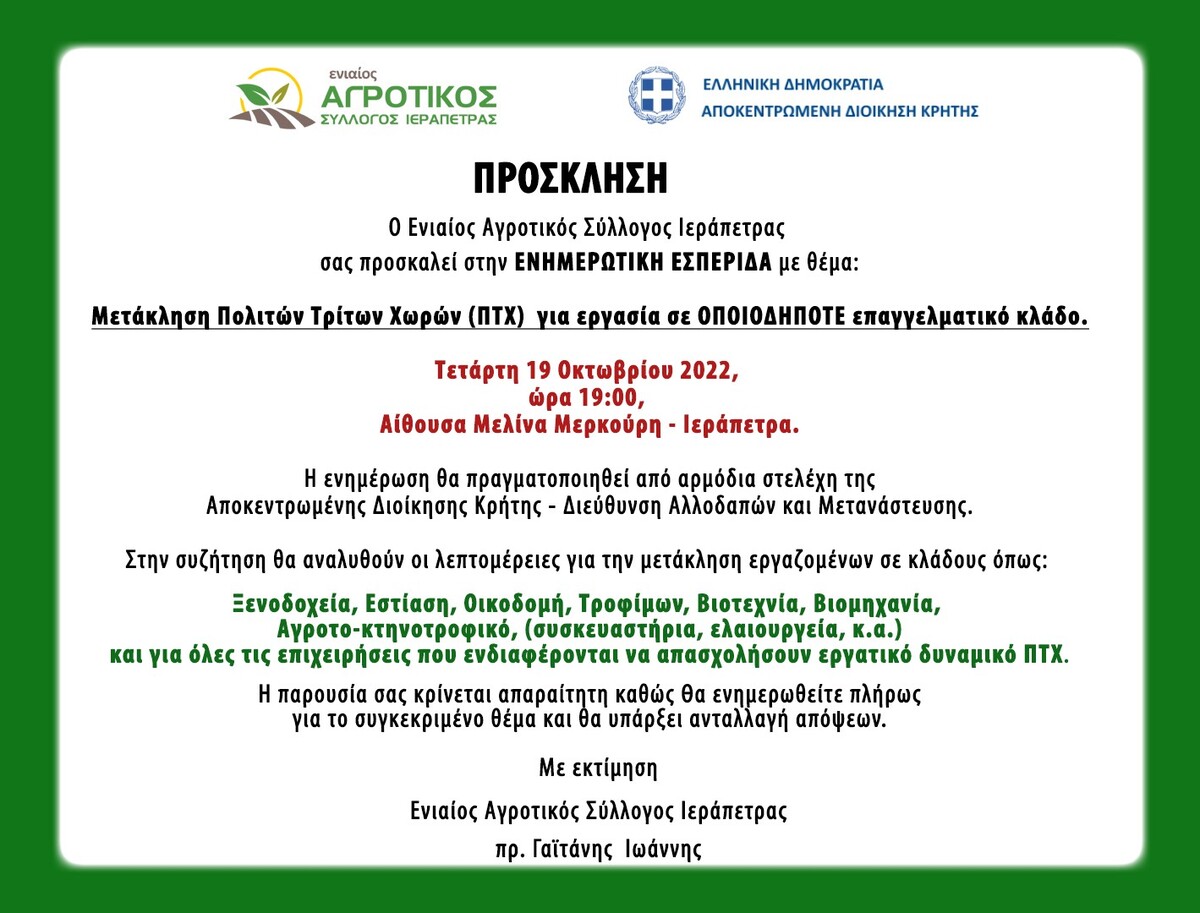 "Ο Ενιαίος Αγροτικός Σύλλογος Ιεράπετρας διοργανώνει ενημερωτική εκδήλωση την επόμενη Τετάρτη 19 Οκτωβρίου 2022 με θέμα την Μετάκληση Πολιτών Τρίτων Χωρών (ΠΤΧ) για εργασία σε οποιοδήποτε επαγγελματικό κλάδο στην Ελλάδα.