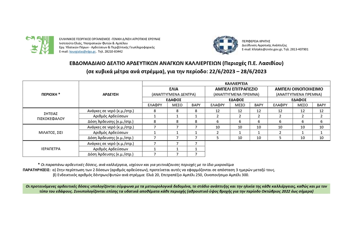 Ενημερωτικό Δελτίο Άρδευσης για την περίοδο από 22 έως 28 Ιουνίου ΕΝΟΤΗΤΕΣ ΚΟΙΝΩΝΙΑ 11:31 π.μ. - Πέμπτη 22 Ιουνίου 2023 11:06 π.μ. - Πέμ, 22/31/2023 ΛΑΣΙΘΙ, ΔΕΛΤΙΟ ΑΡΔΕΥΣΗΣ Για την περίοδο από από 22/06 έως 28/06