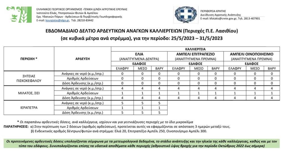 Ενημερωτικό Δελτίο Άρδευσης για την περίοδο από 25 έως 31 Μαϊου ΕΝΟΤΗΤΕΣ ΚΟΙΝΩΝΙΑ 12:09 μ.μ. - Πέμπτη 25 Μαΐου 2023 12:05 μ.μ. - Πέμ, 25/09/2023 ΠΕΡΙΦΕΡΕΙΑ ΚΡΗΤΗΣ , ΔΕΛΤΙΟ ΑΡΔΕΥΣΗΣ Για την περίοδο από 25/05 έως 31/05 Η Περιφέρεια Κρήτης σε συνεργασία με το Ινστιτούτο Ελιάς Υποτροπικών Φυτών & Αμπέλου του ΕΛΓΟ-ΔΗΜΗΤΡΑ σας στέλνει το 2ο Ενημερωτικό Δελτίο Άρδευσης, για την περίοδο από 25/05 έως 31/05/2023.