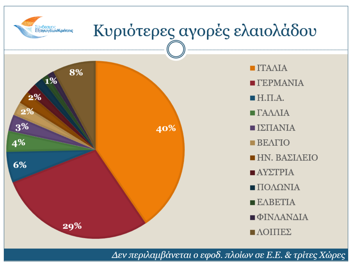 Σχετικά με τις αγορές, οι κυριότεροι αγοραστές των Κρητικών προϊόντων είναι η Γερμανία (μερίδιο 20,3%), η Ιταλία (17%), η Γαλλία (6,1%), η Ολλανδία (5,7%) και η Πολωνία (4,3%). Τη δεκάδα των κυριότερων αγοραστών κλείνουν οι Η.Π.Α., το Ηνωμένο Βασίλειο, η Κύπρος, η Ισπανία και η Αυστρία.