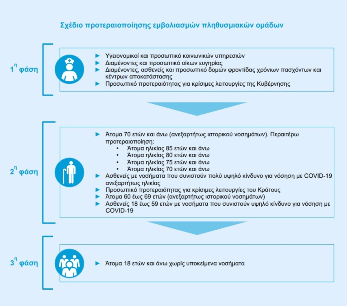 Σύμφωνα με το σχέδιο ο εμβολιασμός του πληθυσμού θα γίνει σε τρεις φάσεις και συγκεκριμένα: