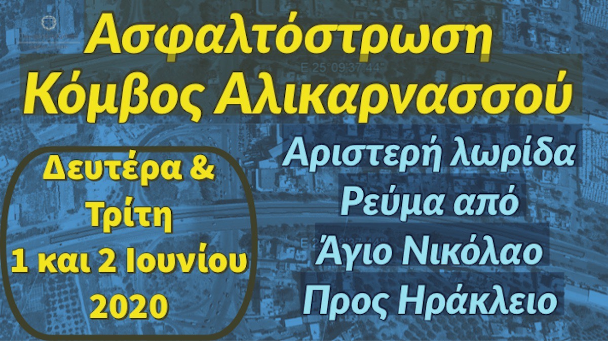 Εργασίες ασφαλτόστρωσης θα πραγματοποιηθούν από αύριο Δευτέρα 1η Ιουνίου έως και την Τρίτη 2 Ιουνίου 2020, στον κόμβο Αλικαρνασσού, στο πλαίσιο του έργου συντήρησης του δρόμου.