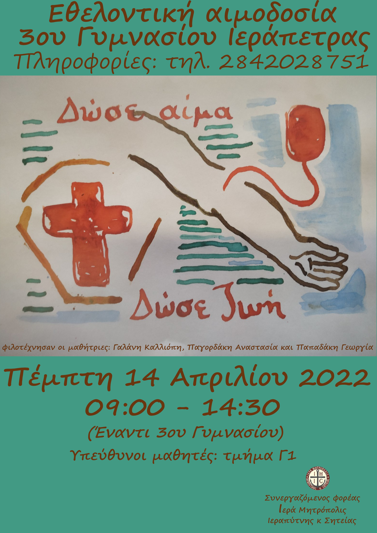Το 3ο Γυμνάσιο Ιεράπετρας στο πλαίσιο του μαθήματος των Θρησκευτικών και σε συνεργασίαμε την Ιερά Μητρόπολη Ιεραπύτνης και Σητείας, οργανώνει εθελοντική αιμοδοσία στο χώρο έναντιτου σχολείου με το σύνθημα «Δώσε Αίμα- Δώσε Ζωή».