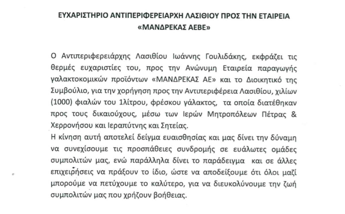 Ευχαριστήριο Αντιπεριφερειάρχη Λασιθίου προς την εταιρεία «ΜΑΝΔΡΕΚΑΣ ΑΕΒΕ» ΕΝΟΤΗΤΕΣ ΚΟΙΝΩΝΙΑ 12:36 μ.μ. - Πέμπτη 2 Απριλίου 2020 12:04 μ.μ. - Πέμ, 02/36/2020 ΑΝΤΙΠΕΡΙΦΕΡΕΙΑΡΧΗΣ ΛΑΣΙΘΙΟΥ, ΜΑΝΔΡΕΚΑΣ ΑΕΒΕ Για την χορήγηση 1000 φιαλών του ενός λίτρου φρέσκου γάλακτος