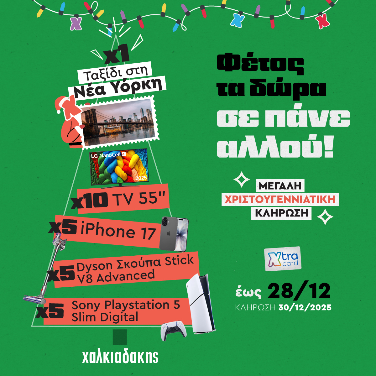 Τα Super Markets Χαλκιαδάκης υποδέχονται τη φετινή εορταστική περίοδο με μια μεγάλη Χριστουγεννιάτικη κλήρωση, που χαρίζει στους πελάτες 26 εντυπωσιακά δώρα και μετατρέπει τις αγορές τους σε μια γιορτινή εμπειρία που… «τους πάει αλλού». Οι εκπλήξεις της χρονιάς είναι μεγαλύτερες από ποτέ, με δώρα που ταξιδεύουν, αναβαθμίζουν την καθημερινότητα και δίνουν χρώμα στις γιορτές.