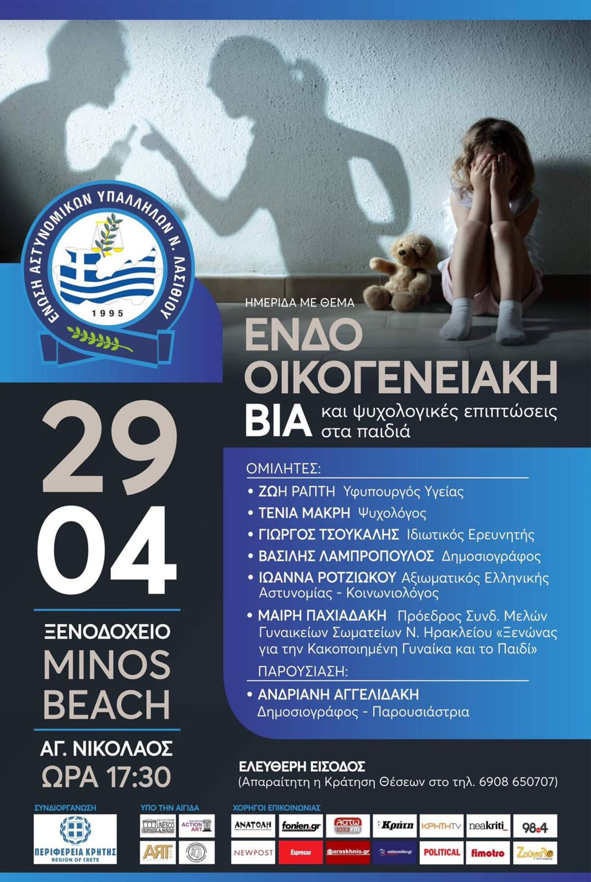 Η Ένωση Αστυνομικών Υπαλλήλων Νομού Λασιθίου θέλοντας να ευαισθητοποιήσει και να αναδείξει το κοινωνικό πρόβλημα της ενδοοικογενειακής βίας, διοργανώνει με την στήριξη της Περιφέρειας Κρήτης, ημερίδα με θέμα «Ενδοοικογενειακή Βία και οι ψυχολογικές επιπτώσεις στα παιδιά».