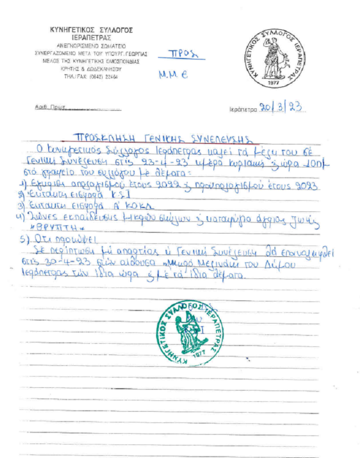 Γενική συνέλευση του Κυνηγετικού Συλλόγου Ιεράπετρας ΛΑΣΙΘΙ ΙΕΡΑΠΕΤΡΑ 12:52 μ.μ. - Παρασκευή 24 Μαρτίου 2023 12:03 μ.μ. - Παρ, 24/52/2023 ΚΥΝΗΓΕΤΙΚΟΣ ΣΥΛΛΟΓΟΣ, ΓΕΝΙΚΗ ΣΥΝΕΛΕΥΣΗ Την Κυριακή 23/04 και ώρα 1.00 μμ