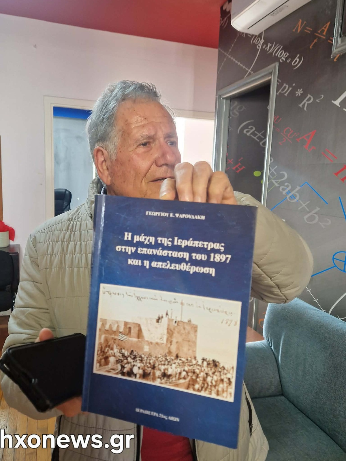 Κορυφαία στιγμή της συζήτησης ήταν η ιστορική αναφορά στην επανάσταση του 1897 και στο βιβλίο του «Η μάχη της Ιεράπετρας στην επανάσταση του 1897 και η απελευθέρωση». Περιέγραψε το «κλειστό» πρόσωπο της παλιάς, περιτειχισμένης πόλης, τις πύλες που έκλειναν, τον «Καλέ», αλλά και τα γεγονότα της εποχής, με ιδιαίτερη μνεία στις πηγές και στα φωτογραφικά ντοκουμέντα.