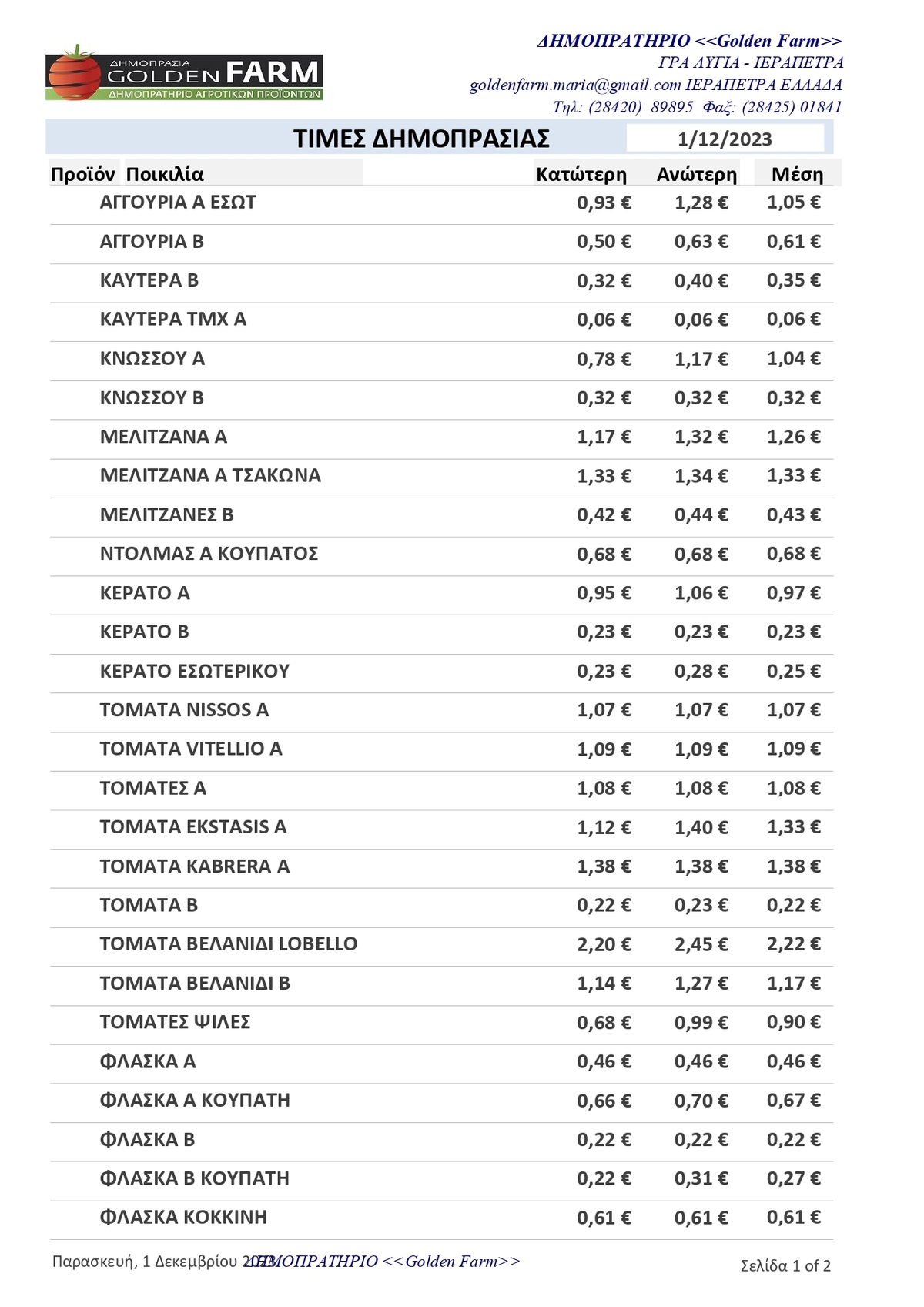 GOLDEN FARM | Τιμές Αγροτικών Προϊόντων 01.12.2023 ΤΙΜΕΣ 7:43 μ.μ. - Παρασκευή 1 Δεκεμβρίου 2023 07:12 μ.μ. - Παρ, 01/43/2023 ΙΕΡΑΠΕΤΡΑ, ΤΙΜΕΣ ΑΓΡΟΤΙΚΩΝ ΠΡΟΙΟΝΤΩΝ , ΔΗΜΟΠΡΑΤΗΡΙΟ, GOLDEN FARM, ΚΗΠΕΥΤΙΚΑ ΠΡΟΙΟΝΤΑ Δείτε τις σημερινές τιμές του δημοπρατηρίου