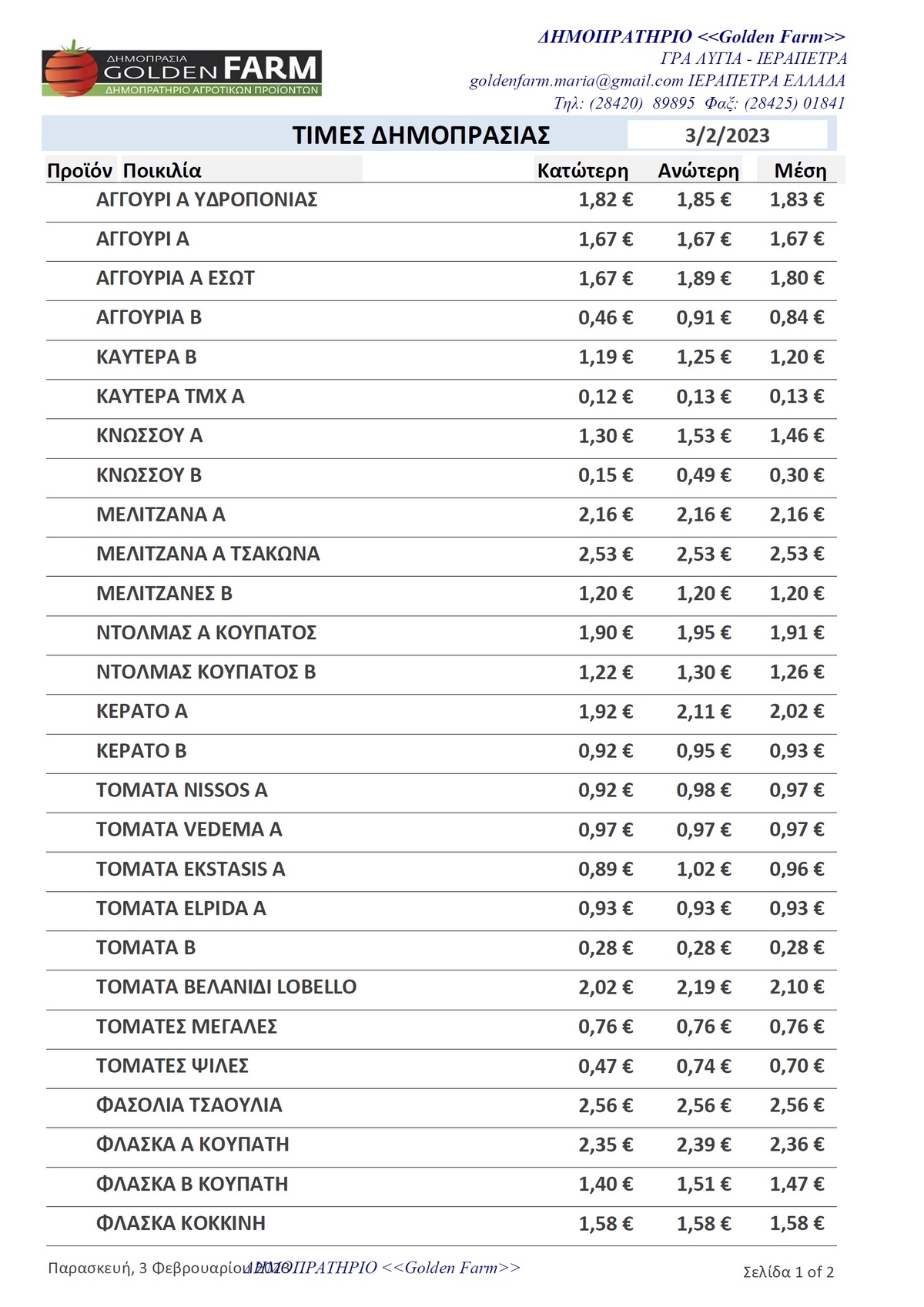 GOLDEN FARM | Τιμές Αγροτικών Προϊόντων 03.02.2023 ΙΕΡΑΠΕΤΡΑ 4:23 μ.μ. - Παρασκευή 3 Φεβρουαρίου 2023 04:02 μ.μ. - Παρ, 03/23/2023 ΙΕΡΑΠΕΤΡΑ, ΤΙΜΕΣ ΑΓΡΟΤΙΚΩΝ ΠΡΟΙΟΝΤΩΝ , GOLDEN FARM, ΚΗΠΕΥΤΙΚΑ ΠΡΟΙΟΝΤΑ Δείτε τις σημερινές τιμές του δημοπρατηρίου