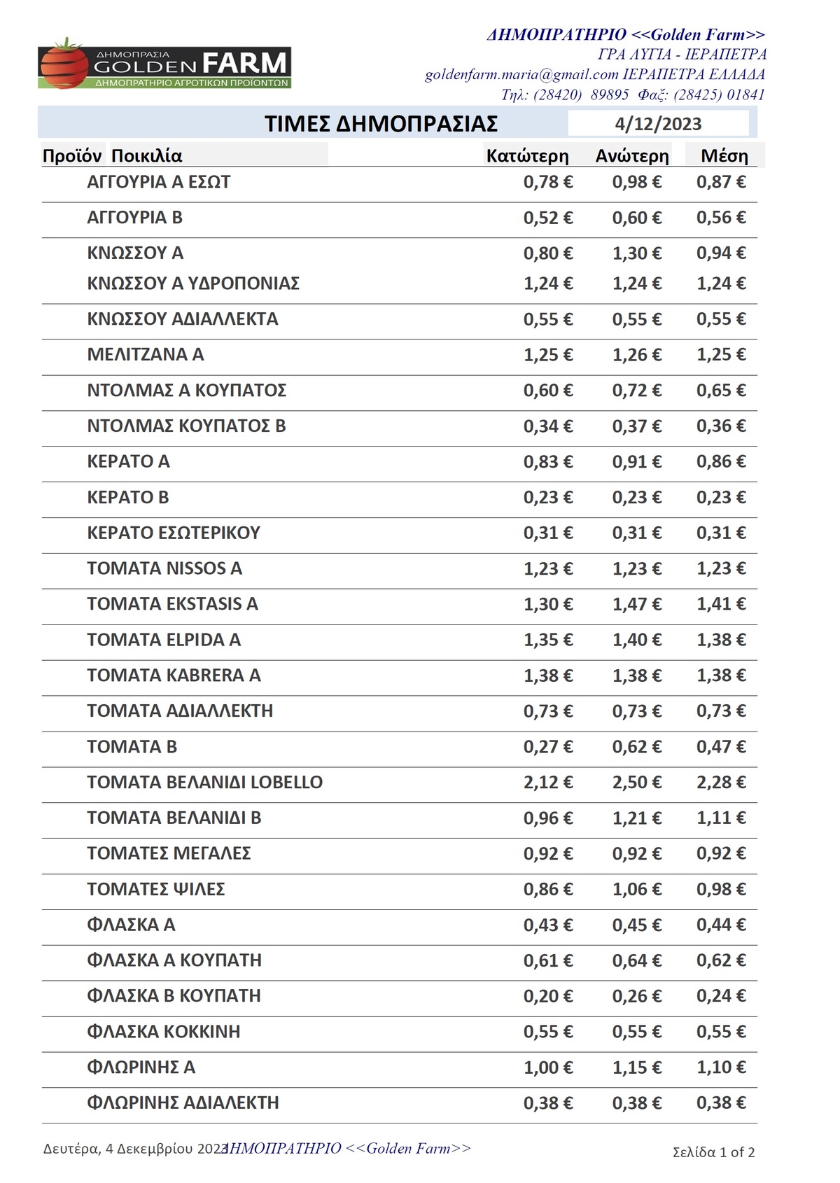GOLDEN FARM | Τιμές Αγροτικών Προϊόντων 04.12.2023 ΤΙΜΕΣ 3:28 μ.μ. - Δευτέρα 4 Δεκεμβρίου 2023 03:12 μ.μ. - Δευ, 04/28/2023 ΙΕΡΑΠΕΤΡΑ, ΤΙΜΕΣ ΑΓΡΟΤΙΚΩΝ ΠΡΟΙΟΝΤΩΝ , ΔΗΜΟΠΡΑΤΗΡΙΟ, GOLDEN FARM, ΚΗΠΕΥΤΙΚΑ ΠΡΟΙΟΝΤΑ Δείτε τις σημερινές τιμές του δημοπρατηρίου