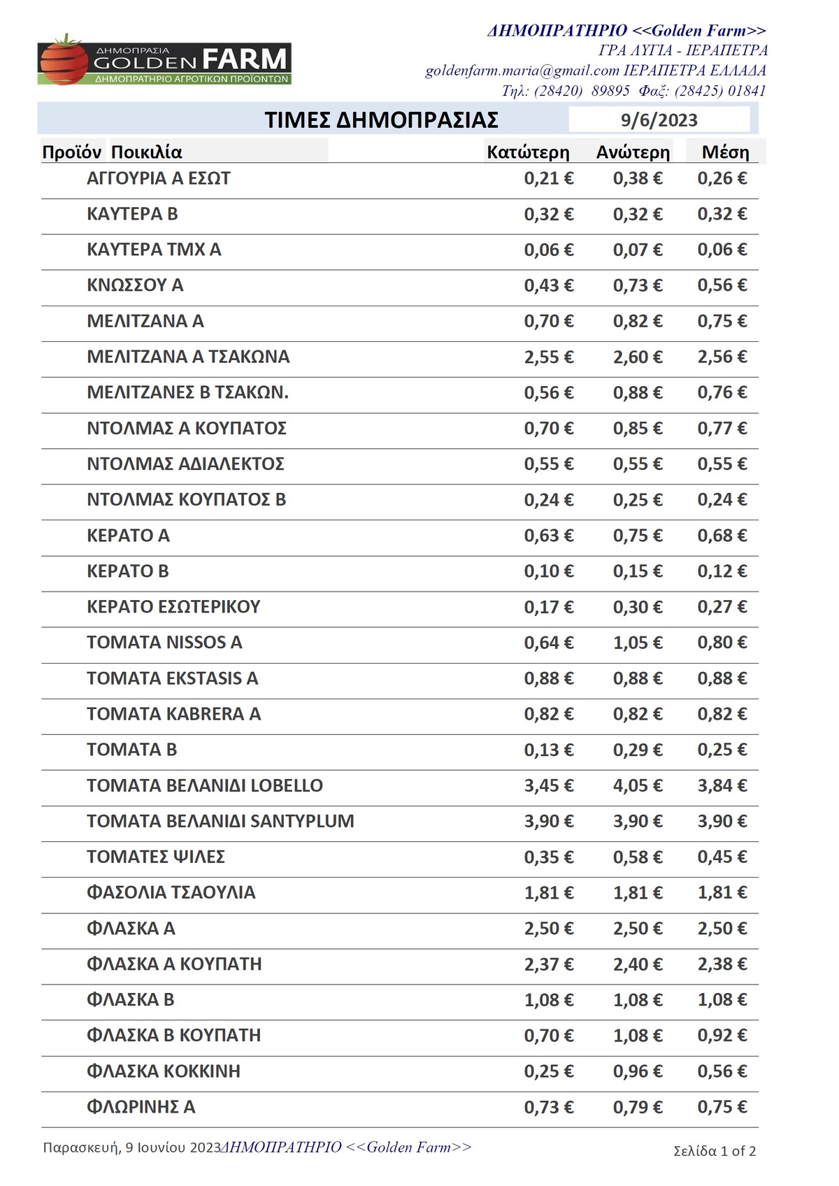 GOLDEN FARM | Τιμές Αγροτικών Προϊόντων 09.06.2023 ΤΙΜΕΣ 6:03 μ.μ. - Παρασκευή 9 Ιουνίου 2023 06:06 μ.μ. - Παρ, 09/03/2023 ΙΕΡΑΠΕΤΡΑ, ΤΙΜΕΣ ΑΓΡΟΤΙΚΩΝ ΠΡΟΙΟΝΤΩΝ , ΔΗΜΟΠΡΑΤΗΡΙΟ, GOLDEN FARM, ΚΗΠΕΥΤΙΚΑ ΠΡΟΙΟΝΤΑ Δείτε τις σημερινές τιμές του δημοπρατηρίου