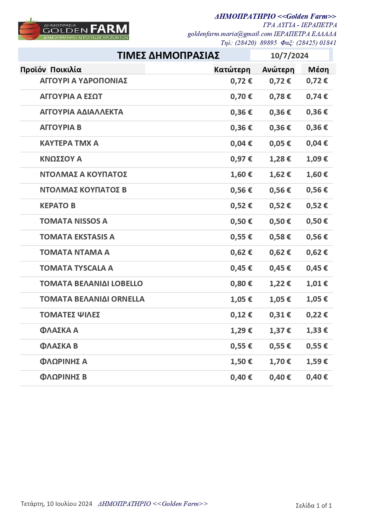 GOLDEN FARM | Τιμές Αγροτικών Προϊόντων 10.07.2024 ΤΙΜΕΣ 8:49 π.μ. - Πέμπτη 11 Ιουλίου 2024 08:07 π.μ. - Πέμ, 11/49/2024 ΤΙΜΕΣ ΑΓΡΟΤΙΚΩΝ ΠΡΟΙΟΝΤΩΝ Δείτε τις τιμές του δημοπρατηρίου