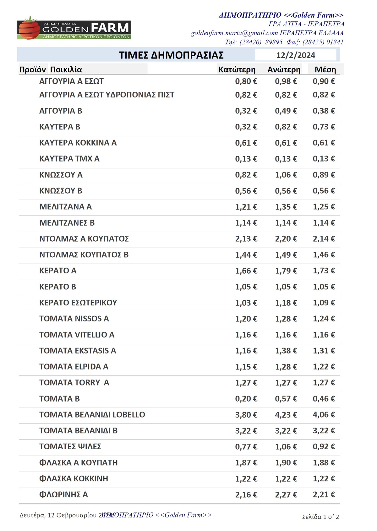 ΤΙΜΕΣ 02:17 μ.μ. - 02/02/2026 GOLDEN FARM |Τιμές Αγροτικών Προϊόντων 02.02.2026 ΙΕΡΑΠΕΤΡΑ, ΤΙΜΕΣ ΑΓΡΟΤΙΚΩΝ ΠΡΟΙΟΝΤΩΝ , ΚΗΠΕΥΤΙΚΑ , ΔΗΜΟΠΡΑΣΙΑ, GOLDEN FARM Δείτε τις σημερινές τιμές του δημοπρατηρίου