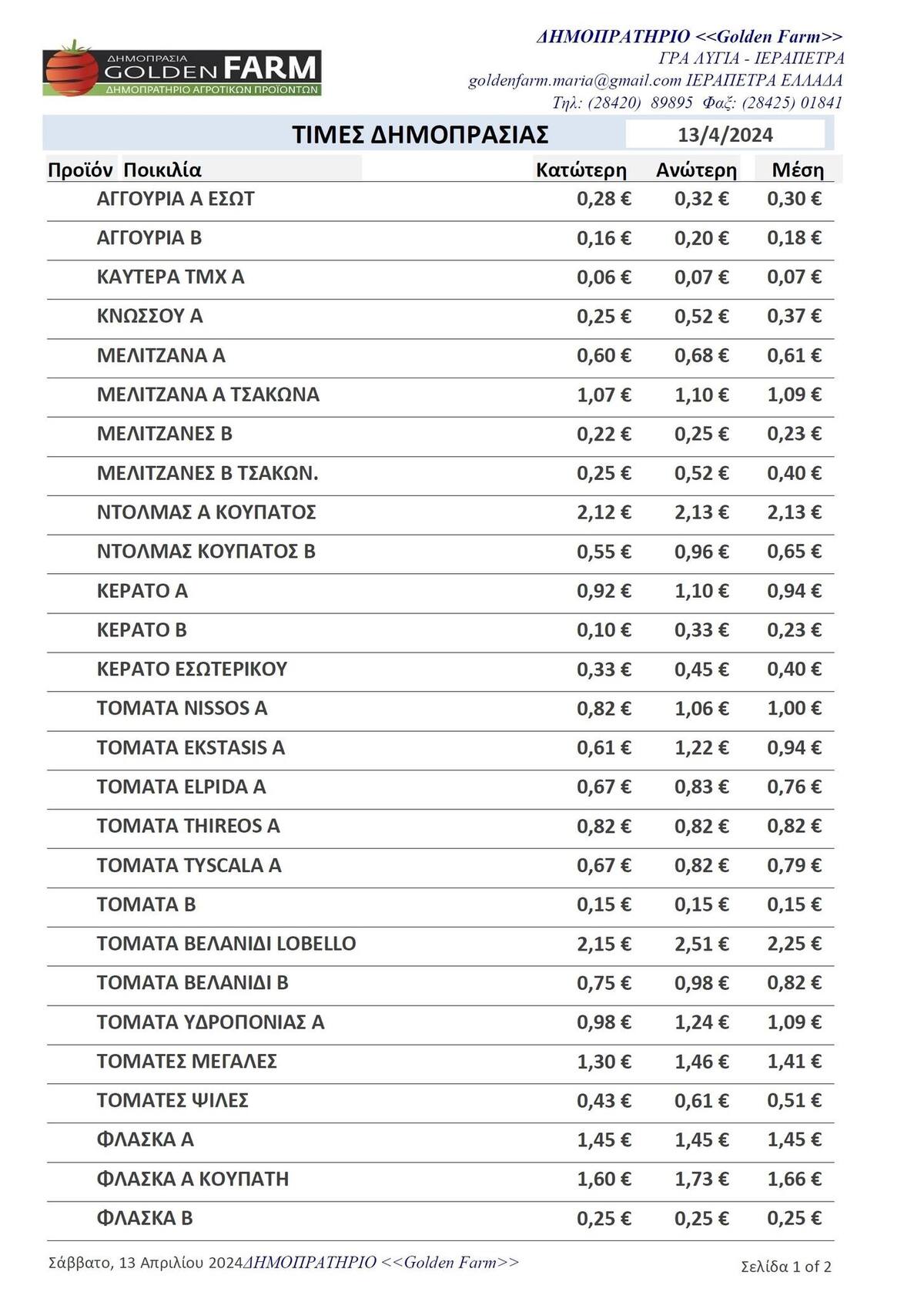 GOLDEN FARM | Τιμές Αγροτικών Προϊόντων 13.04.2024 ΤΙΜΕΣ 4:30 μ.μ. - Σάββατο 13 Απριλίου 2024 04:04 μ.μ. - Σάβ, 13/30/2024 ΙΕΡΑΠΕΤΡΑ, ΤΙΜΕΣ ΑΓΡΟΤΙΚΩΝ ΠΡΟΙΟΝΤΩΝ , ΔΗΜΟΠΡΑΤΗΡΙΟ, ΚΗΠΕΥΤΙΚΑ, GOLDEN FARM Δείτε τις σημερινές τιμές του δημοπρατηρίου