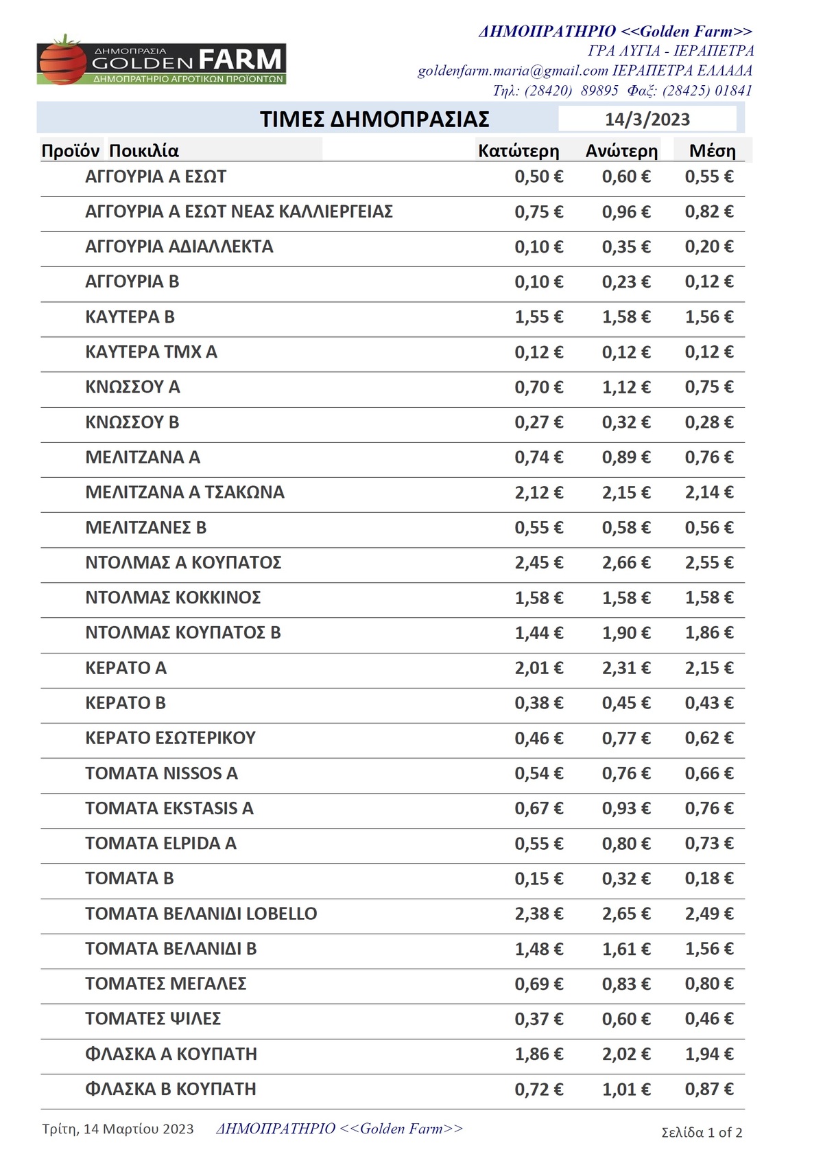 GOLDEN FARM | Τιμές Αγροτικών Προϊόντων 14.03.2023 ΟΙΚΟΝΟΜΙΑ 4:29 μ.μ. - Τρίτη 14 Μαρτίου 2023 04:03 μ.μ. - Τρί, 14/29/2023 ΙΕΡΑΠΕΤΡΑ, ΤΙΜΕΣ ΑΓΡΟΤΙΚΩΝ ΠΡΟΙΟΝΤΩΝ , ΔΗΜΟΠΡΑΤΗΡΙΟ, GOLDEN FARM, ΚΗΠΕΥΤΙΚΑ ΠΡΟΙΟΝΤΑ Η σημερινές τιμές του δημοπρατηρίου