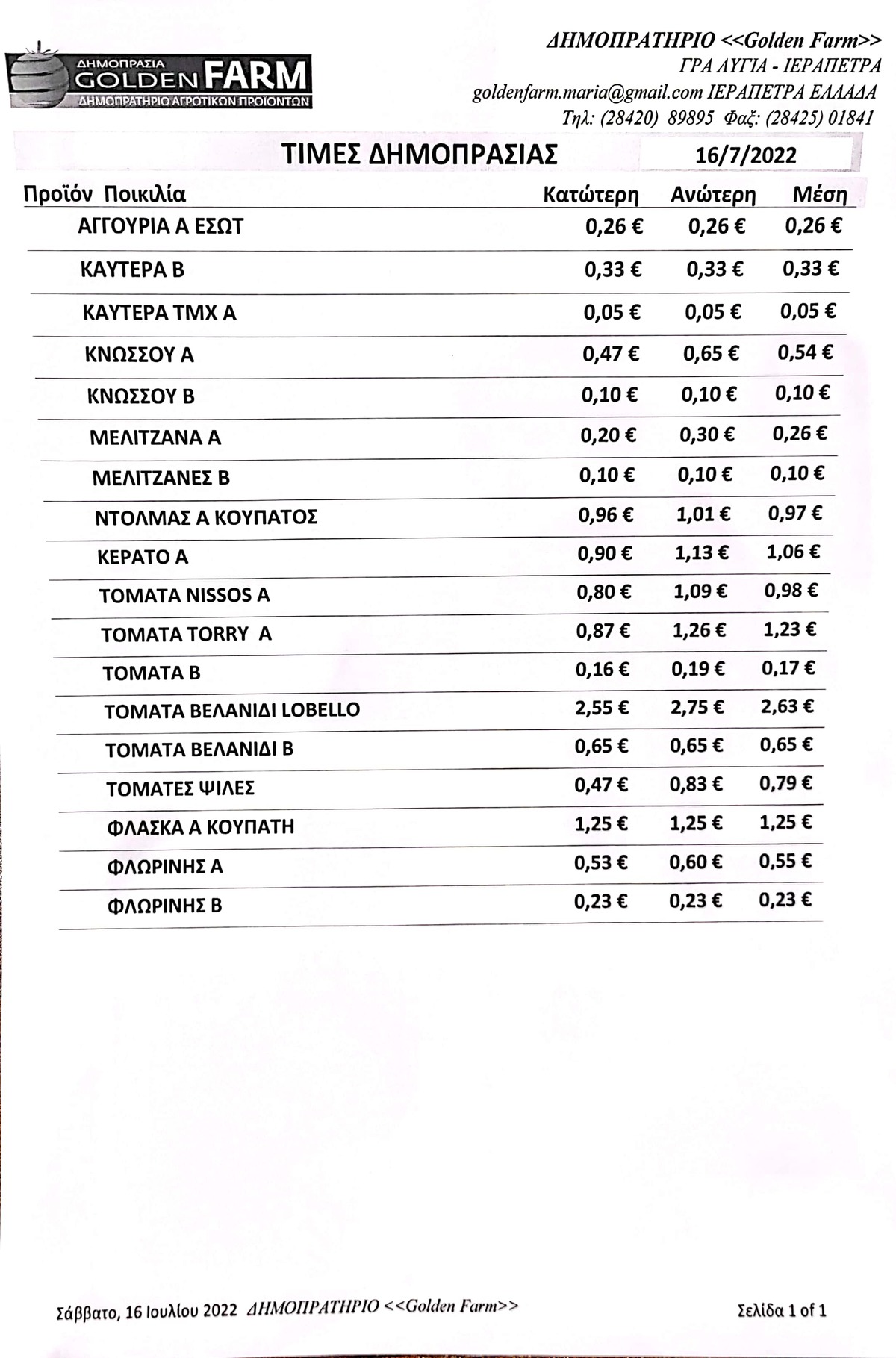 GOLDEN FARM | Τιμές Αγροτικών Προϊόντων 16.07.2022 ΙΕΡΑΠΕΤΡΑ 3:31 μ.μ. - Σάββατο 16 Ιουλίου 2022 03:07 μ.μ. - Σάβ, 16/31/2022 ΙΕΡΑΠΕΤΡΑ, ΤΙΜΕΣ ΑΓΡΟΤΙΚΩΝ ΠΡΟΙΟΝΤΩΝ , ΔΗΜΟΠΡΑΤΗΡΙΟ, ΚΗΠΕΥΤΙΚΑ, GOLDEN FARM Δείτε τις σημερνές τιμές του δημοπρατηρίου