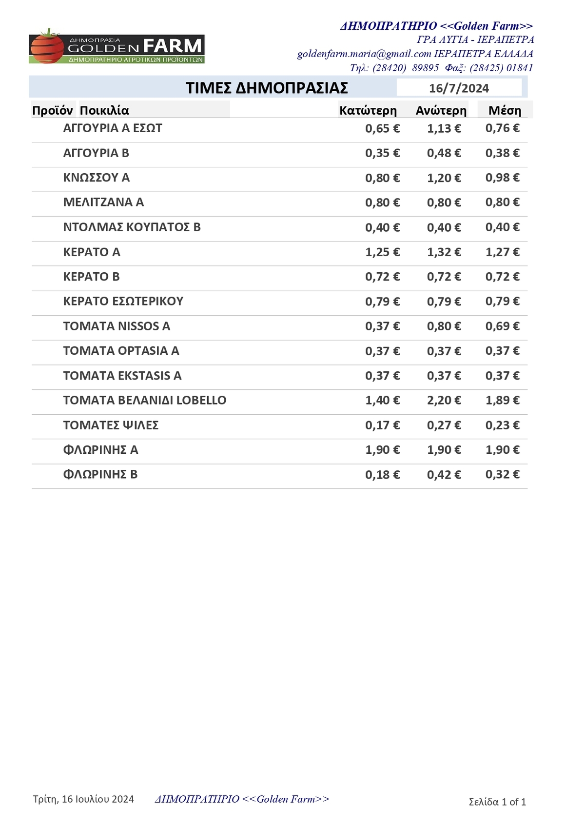 GOLDEN FARM | Τιμές Αγροτικών Προϊόντων 16.07.2024 ΤΙΜΕΣ 9:26 π.μ. - Τετάρτη 17 Ιουλίου 2024 09:07 π.μ. - Τετ, 17/26/2024 ΤΙΜΕΣ ΑΓΡΟΤΙΚΩΝ ΠΡΟΙΟΝΤΩΝ Δείτε τις τιμές του δημοπρατηρίου