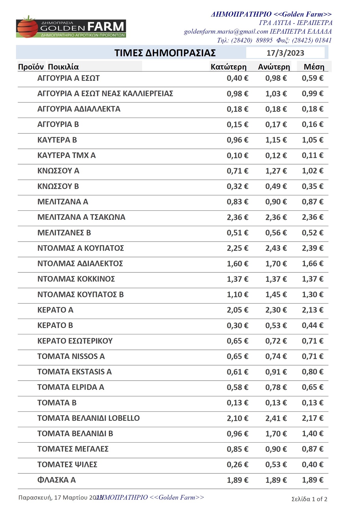 GOLDEN FARM | Τιμές Αγροτικών Προϊόντων 17.03.2023 ΟΙΚΟΝΟΜΙΑ 6:14 μ.μ. - Παρασκευή 17 Μαρτίου 2023 06:03 μ.μ. - Παρ, 17/14/2023 ΤΙΜΕΣ ΑΓΡΟΤΙΚΩΝ ΠΡΟΙΟΝΤΩΝ, ΔΗΜΟΠΡΑΤΗΡΙΟ, GOLDEN FARM, ΚΗΠΕΥΤΙΚΑ ΠΡΟΙΟΝΤΑ Η σημερινές τιμές του δημοπρατηρίου