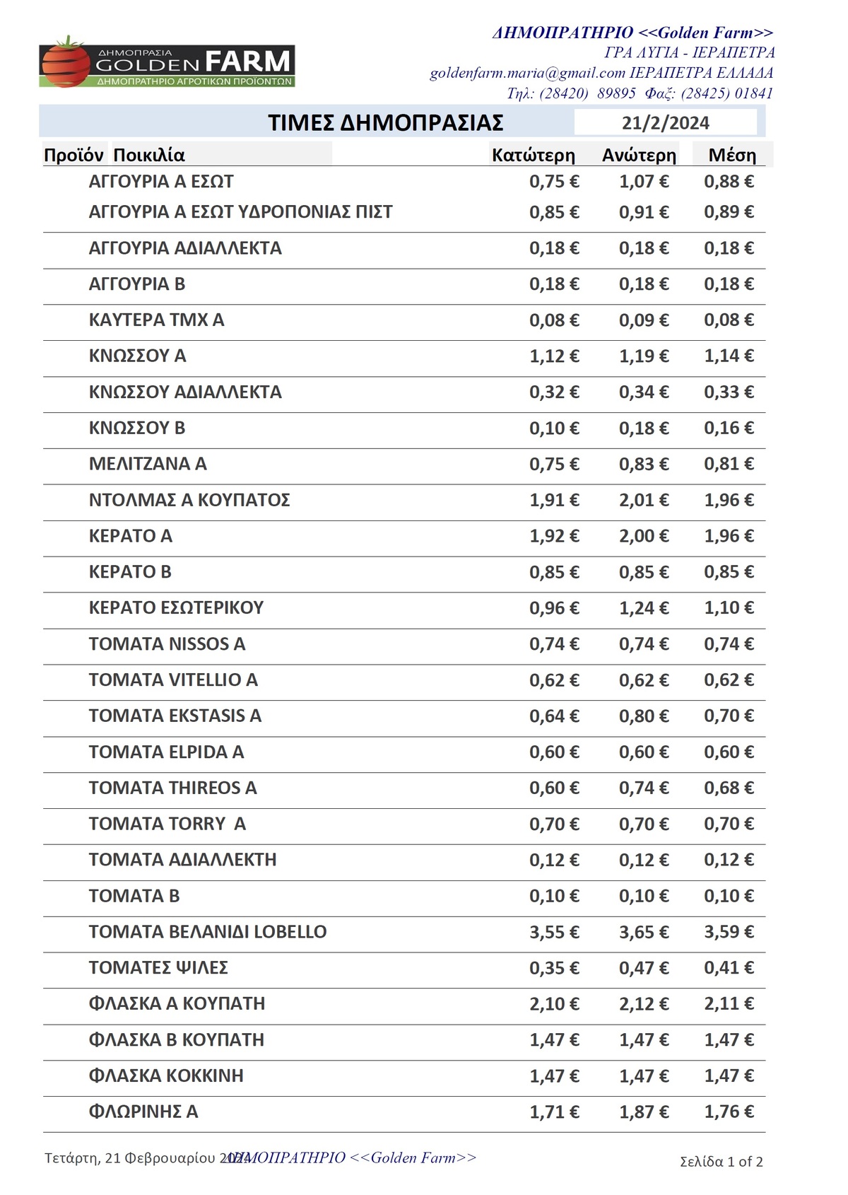 GOLDEN FARM | Τιμές Αγροτικών Προϊόντων 21.02.2024 ΤΙΜΕΣ 3:40 μ.μ. - Τετάρτη 21 Φεβρουαρίου 2024 03:02 μ.μ. - Τετ, 21/40/2024 ΙΕΡΑΠΕΤΡΑ, ΤΙΜΕΣ ΑΓΡΟΤΙΚΩΝ ΠΡΟΙΟΝΤΩΝ , ΔΗΜΟΠΡΑΤΗΡΙΟ, ΚΗΠΕΥΤΙΚΑ , GOLDEN FARM Δείτε τις σημερινές τιμές του δημοπρατηρίου