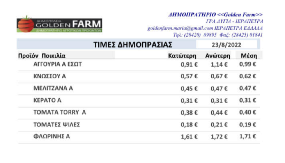 GOLDEN FARM | Τιμές Αγροτικών Προϊόντων 23.8.2022 ΛΑΣΙΘΙ ΙΕΡΑΠΕΤΡΑ 1:00 μ.μ. - Τρίτη 23 Αυγούστου 2022 01:08 μ.μ. - Τρί, 23/00/2022 ΤΙΜΕΣ ΑΓΡΟΤΙΚΩΝ ΠΡΟΙΟΝΤΩΝ, GOLDENFARM Δείτε τις σημερινές τιμές του δημοπρατηρίου