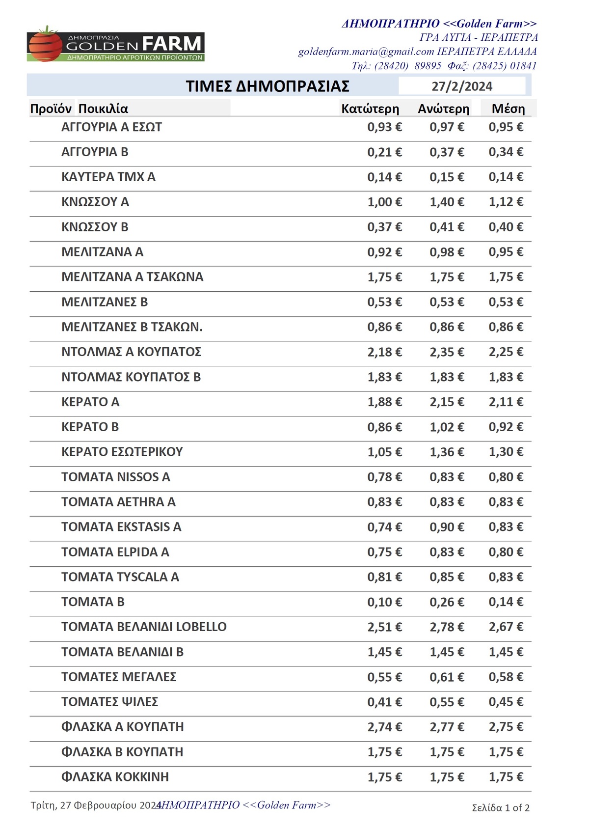 GOLDEN FARM | Τιμές Αγροτικών Προϊόντων 27.02.2024 ΤΙΜΕΣ 4:13 μ.μ. - Τρίτη 27 Φεβρουαρίου 2024 04:02 μ.μ. - Τρί, 27/13/2024 ΙΕΡΑΠΕΤΡΑ, ΤΙΜΕΣ ΑΓΡΟΤΙΚΩΝ ΠΡΟΙΟΝΤΩΝ , ΔΗΜΟΠΡΑΤΗΡΙΟ, GOLDEN FARM, ΚΗΠΕΥΤΙΚΑ ΠΡΟΙΟΝΤΑ Δείτε τις σημερινές τιμές του δημοπρατηρίου