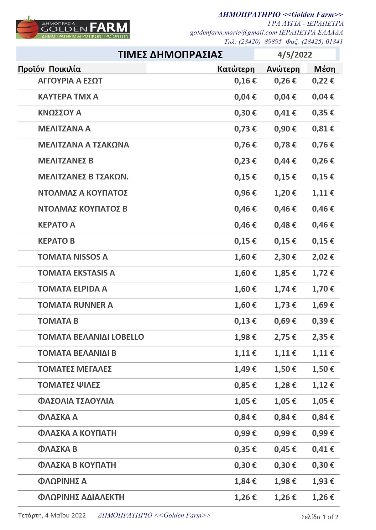 GOLDEN FARM | Τιμές Αγροτικών Προϊόντων 4-5- 2022 ΙΕΡΑΠΕΤΡΑ 4:02 μ.μ. - Τετάρτη 4 Μαΐου 2022 04:05 μ.μ. - Τετ, 04/02/2022 ΙΕΡΑΠΕΤΡΑ, ΤΙΜΕΣ ΑΓΡΟΤΙΚΩΝ ΠΡΟΙΟΝΤΩΝ, ΔΗΜΟΠΡΑΤΗΡΙΟ, ΚΗΠΕΥΤΙΚΑ , GOLDEN FARM Δείτε τις τιμές του δημοπρατηρίου