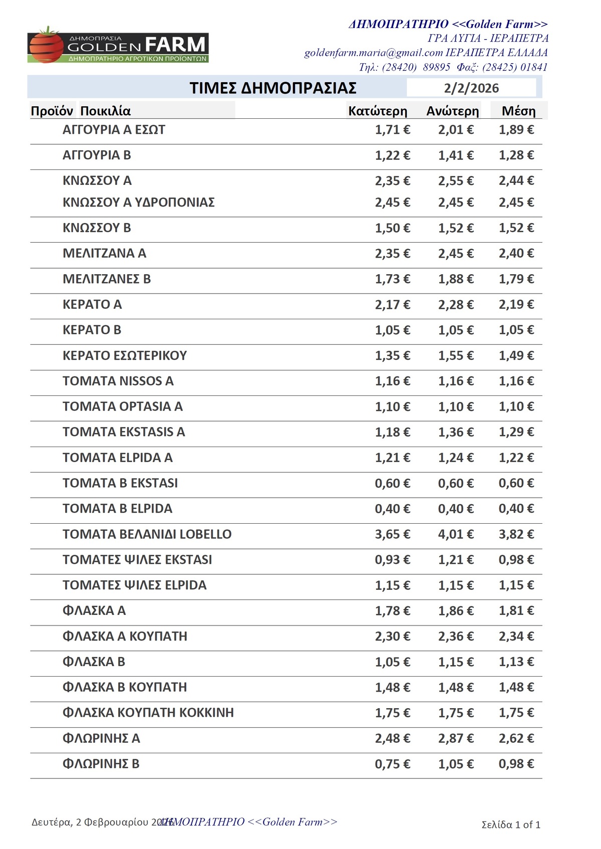 GOLDEN FARM |Τιμές Αγροτικών Προϊόντων 02.02.2026 ΤΙΜΕΣ 2:17 μ.μ. - Δευτέρα 2 Φεβρουαρίου 2026 02:02 μ.μ. - Δευ, 02/17/2026 ΙΕΡΑΠΕΤΡΑ, ΤΙΜΕΣ ΑΓΡΟΤΙΚΩΝ ΠΡΟΙΟΝΤΩΝ , ΚΗΠΕΥΤΙΚΑ , ΔΗΜΟΠΡΑΣΙΑ, GOLDEN FARM Δείτε τις σημερινές τιμές του δημοπρατηρίου