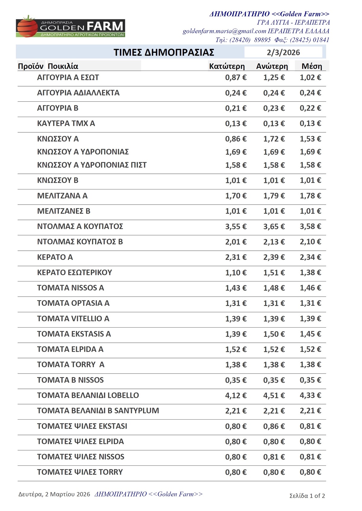 GOLDEN FARM |Τιμές Αγροτικών Προϊόντων 02.03.2026 ΤΙΜΕΣ 5:36 μ.μ. - Δευτέρα 2 Μαρτίου 2026 05:03 μ.μ. - Δευ, 02/36/2026 ΙΕΡΑΠΕΤΡΑ, ΤΙΜΕΣ ΑΓΡΟΤΙΚΩΝ ΠΡΟΙΟΝΤΩΝ , ΚΗΠΕΥΤΙΚΑ , ΔΗΜΟΠΡΑΣΙΑ, GOLDEN FARM Δείτε τις σημερινές τιμές του δημοπρατηρίου