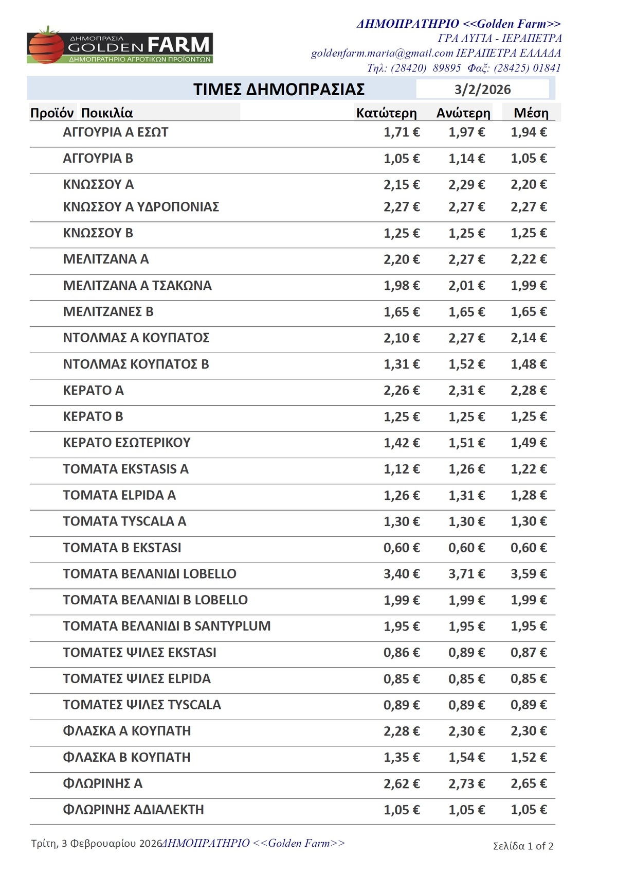 GOLDEN FARM |Τιμές Αγροτικών Προϊόντων 03.02.2026 ΤΙΜΕΣ 2:14 μ.μ. - Τρίτη 3 Φεβρουαρίου 2026 02:02 μ.μ. - Τρί, 03/14/2026 ΙΕΡΑΠΕΤΡΑ, ΤΙΜΕΣ ΑΓΡΟΤΙΚΩΝ ΠΡΟΙΟΝΤΩΝ , ΔΗΜΟΠΡΑΤΗΡΙΟ, ΚΗΠΕΥΤΙΚΑ , GOLDEN FARM Δείτε τις σημερινές τιμές του δημοπρατηρίου