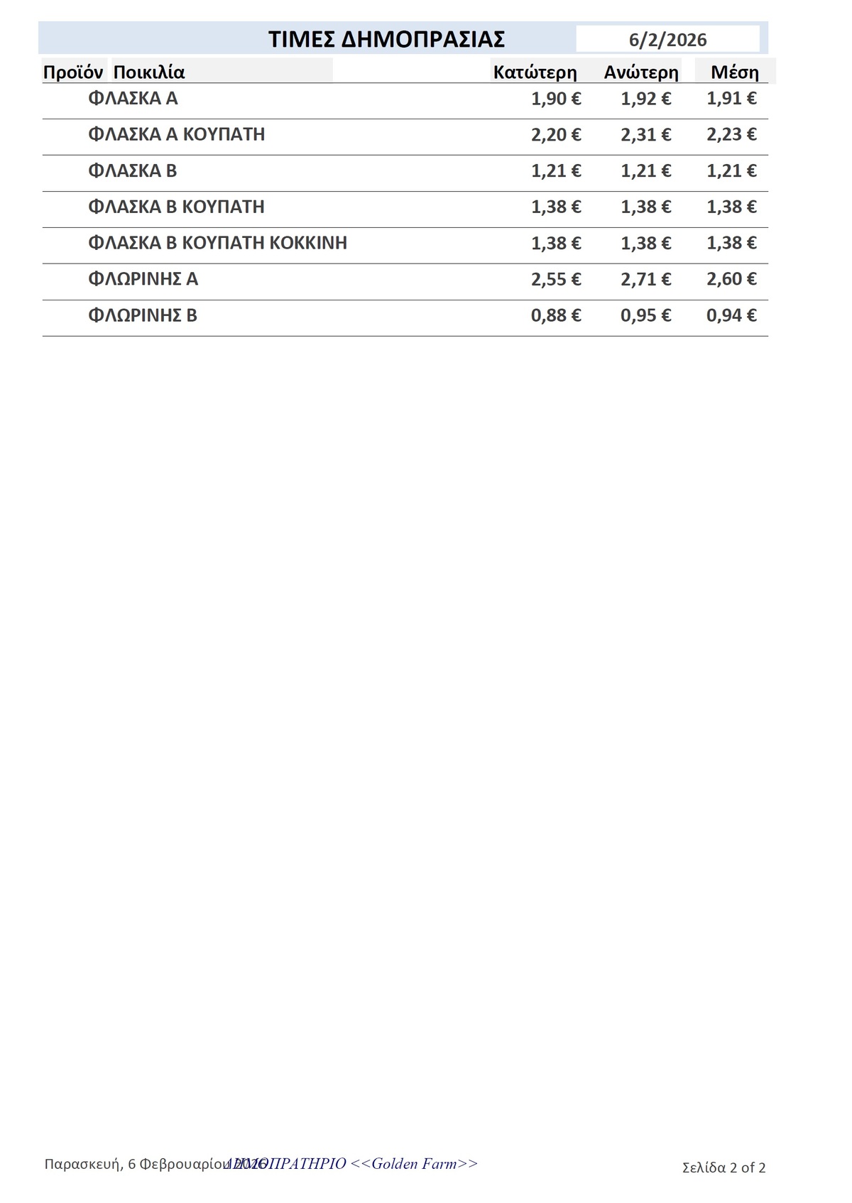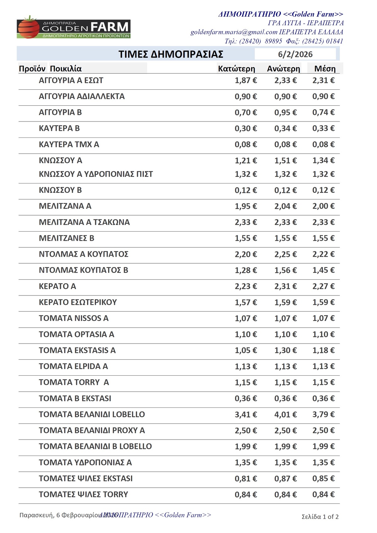 ΤΙΜΕΣ 02:17 μ.μ. - 02/02/2026 GOLDEN FARM |Τιμές Αγροτικών Προϊόντων 02.02.2026 ΙΕΡΑΠΕΤΡΑ, ΤΙΜΕΣ ΑΓΡΟΤΙΚΩΝ ΠΡΟΙΟΝΤΩΝ , ΚΗΠΕΥΤΙΚΑ , ΔΗΜΟΠΡΑΣΙΑ, GOLDEN FARM Δείτε τις σημερινές τιμές του δημοπρατηρίου