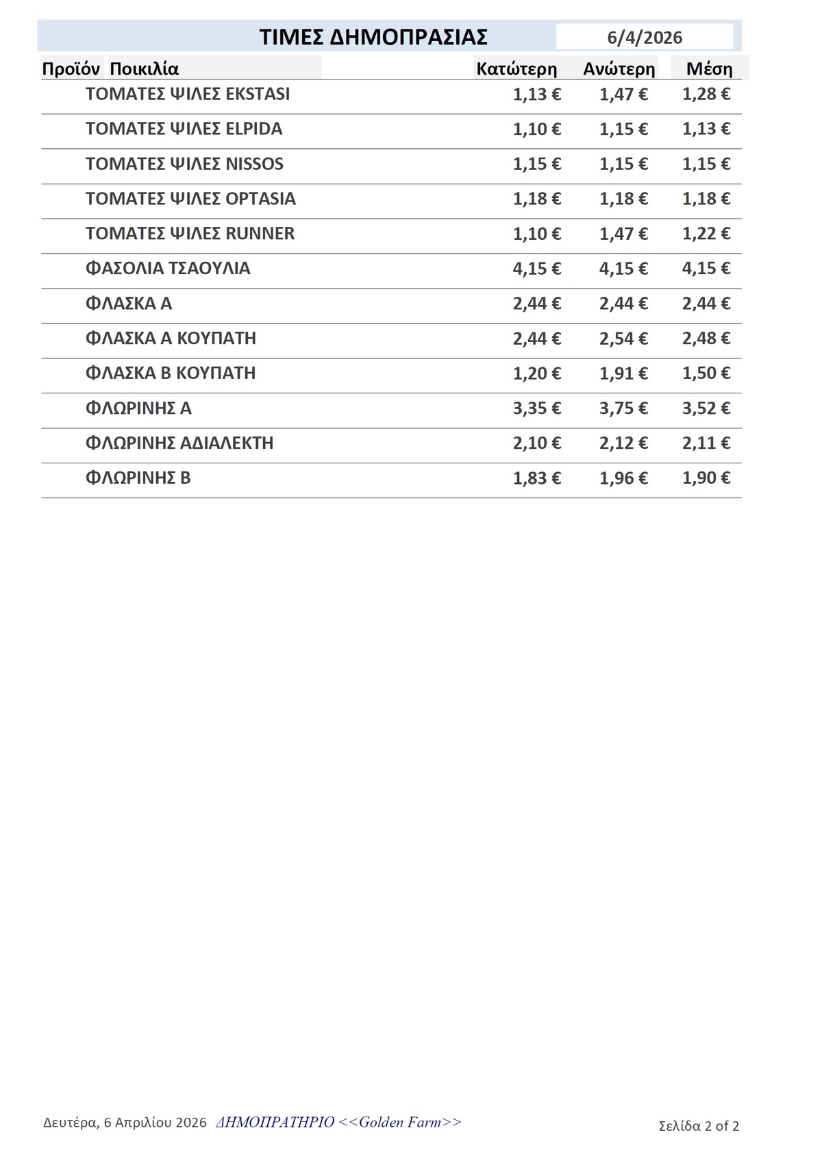 GOLDEN FARM |Τιμές Αγροτικών Προϊόντων 06.04.2026 ΤΙΜΕΣ 2:04 μ.μ. - Δευτέρα 6 Απριλίου 2026 02:04 μ.μ. - Δευ, 06/04/2026 ΙΕΡΑΠΕΤΡΑ, ΤΙΜΕΣ ΑΓΡΟΤΙΚΩΝ ΠΡΟΙΟΝΤΩΝ , ΔΗΜΟΠΡΑΤΗΡΙΟ, ΚΗΠΕΥΤΙΚΑ , GOLDEN FARM Δείτε τις σημερινές τιμές του δημοπρατηρίου