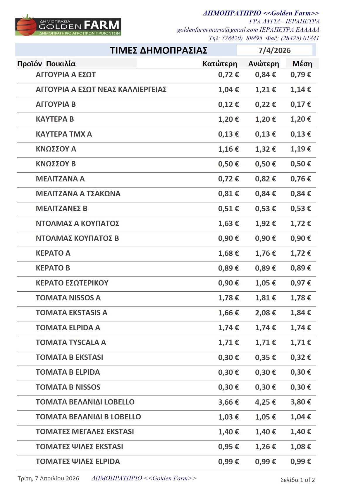 GOLDEN FARM |Τιμές Αγροτικών Προϊόντων 07.04.2026 ΤΙΜΕΣ 1:42 μ.μ. - Τρίτη 7 Απριλίου 2026 01:04 μ.μ. - Τρί, 07/42/2026 ΙΕΡΑΠΕΤΡΑ, ΤΙΜΕΣ ΑΓΡΟΤΙΚΩΝ ΠΡΟΙΟΝΤΩΝ , ΔΗΜΟΠΡΑΤΗΡΙΟ, ΚΗΠΕΥΤΙΚΑ , GOLDEN FARM Δείτε τις σημερινές τιμές του δημοπρατηρίου