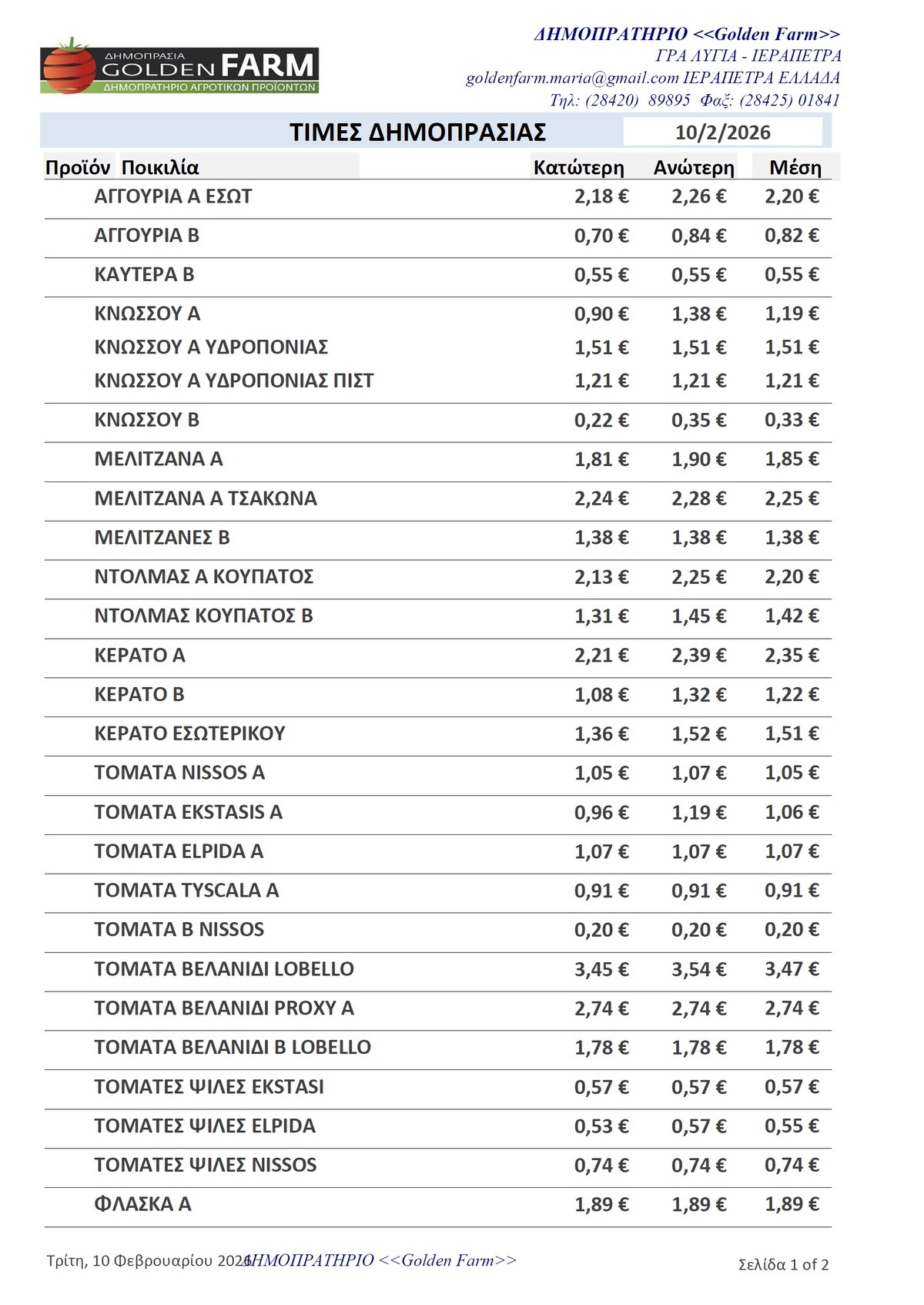 GOLDEN FARM |Τιμές Αγροτικών Προϊόντων 10.02.2026 ΤΙΜΕΣ 2:15 μ.μ. - Τρίτη 10 Φεβρουαρίου 2026 02:02 μ.μ. - Τρί, 10/15/2026 ΙΕΡΑΠΕΤΡΑ, ΤΙΜΕΣ ΑΓΡΟΤΙΚΩΝ ΠΡΟΙΟΝΤΩΝ , ΔΗΜΟΠΡΑΤΗΡΙΟ, ΚΗΠΕΥΤΙΚΑ , GOLDEN FARM Δείτε τις σημερινές τιμές του δημοπρατηρίου