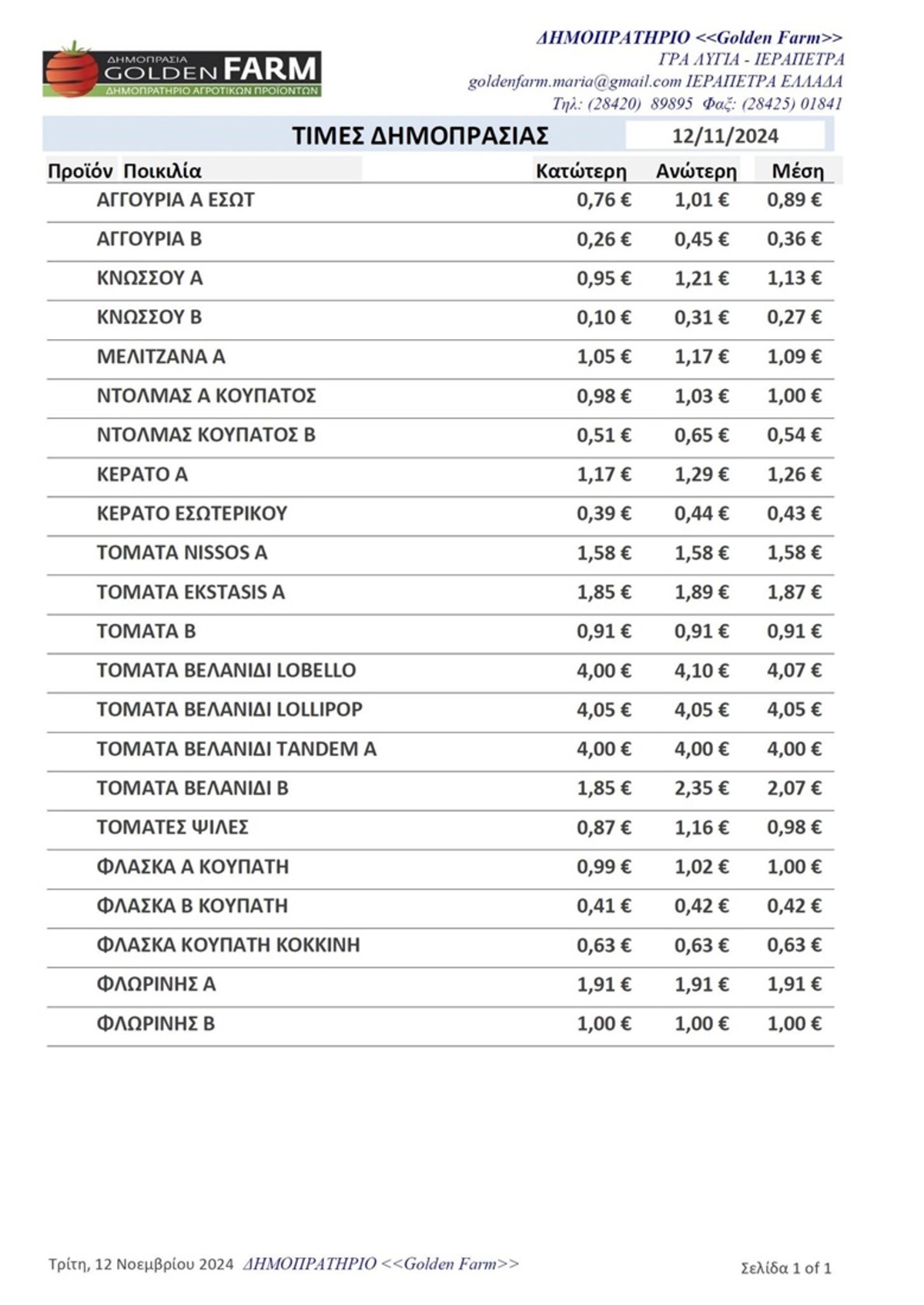 ΤΙΜΕΣ 02:29 μ.μ. - 17/03/2026 GOLDEN FARM |Τιμές Αγροτικών Προϊόντων 17.03.2026 ΙΕΡΑΠΕΤΡΑ, ΤΙΜΕΣ ΑΓΡΟΤΙΚΩΝ ΠΡΟΙΟΝΤΩΝ, ΔΗΜΟΠΡΑΤΗΡΙΟ, ΚΗΠΕΥΤΙΚΑ , GOLDEN FARM Δείτε τις σημερινές τιμές του δημοπρατηρίου