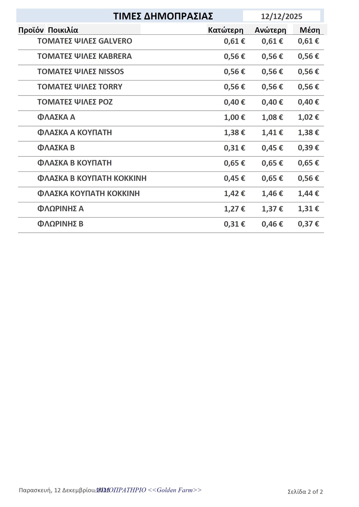 GOLDEN FARM |Τιμές Αγροτικών Προϊόντων 12.12.2025 ΤΙΜΕΣ 5:20 μ.μ. - Παρασκευή 12 Δεκεμβρίου 2025 05:12 μ.μ. - Παρ, 12/20/2025 ΤΙΜΕΣ ΑΓΡΟΤΙΚΩΝ ΠΡΟΙΟΝΤΩΝ, ΔΗΜΟΠΡΑΤΗΡΙΟ, ΚΗΠΕΥΤΙΚΑ , GOLDEN FARM Δείτε τις σημερινές τιμές του δημοπρατηρίου