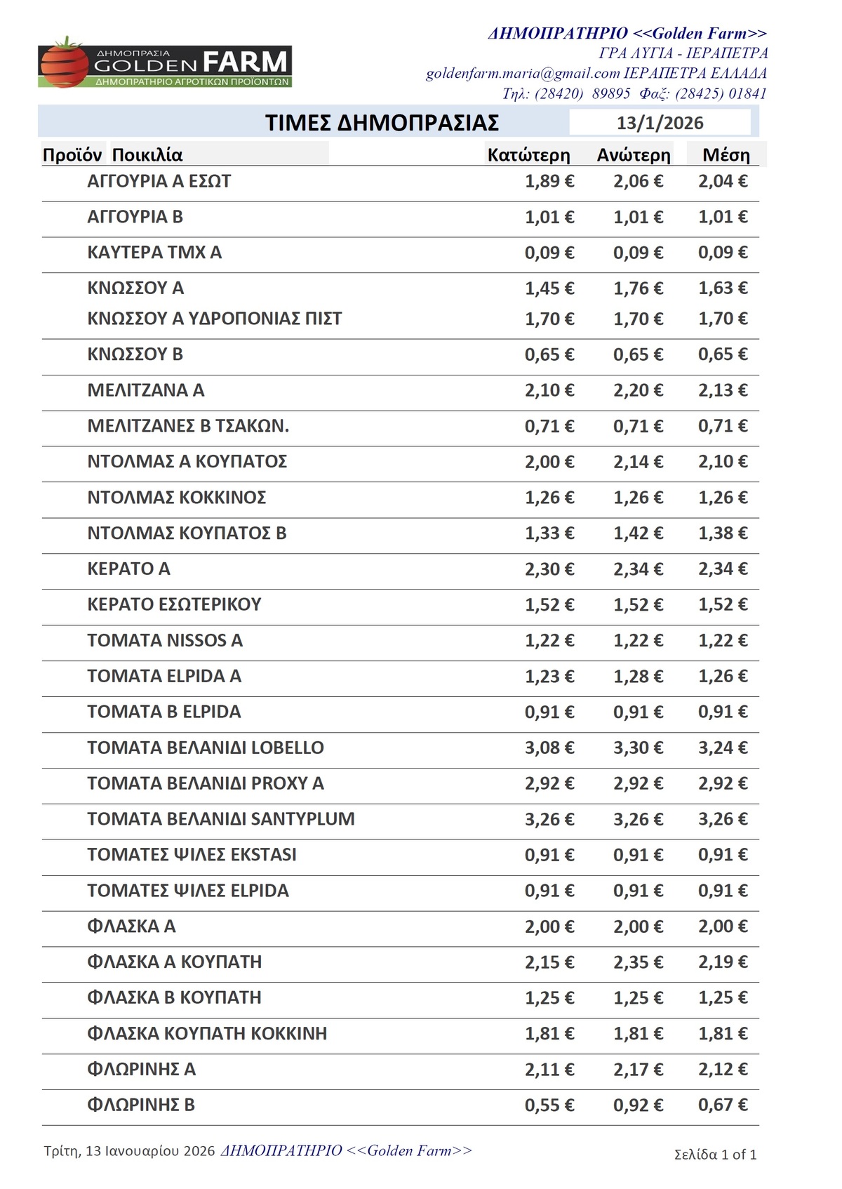 GOLDEN FARM |Τιμές Αγροτικών Προϊόντων 13.01.2026 ΤΙΜΕΣ 3:40 μ.μ. - Τρίτη, 13 Ιανουαρίου 2026 03:01 μ.μ. - Τρί, 13/40/2026 ΙΕΡΑΠΕΤΡΑ, ΤΙΜΕΣ ΑΓΡΟΤΙΚΩΝ ΠΡΟΙΟΝΤΩΝ , ΔΗΜΟΠΡΑΤΗΡΙΟ, ΚΗΠΕΥΤΙΚΑ , GOLDEN FARM Δείτε τις σημερινές τιμές του δημοπρατηρίου