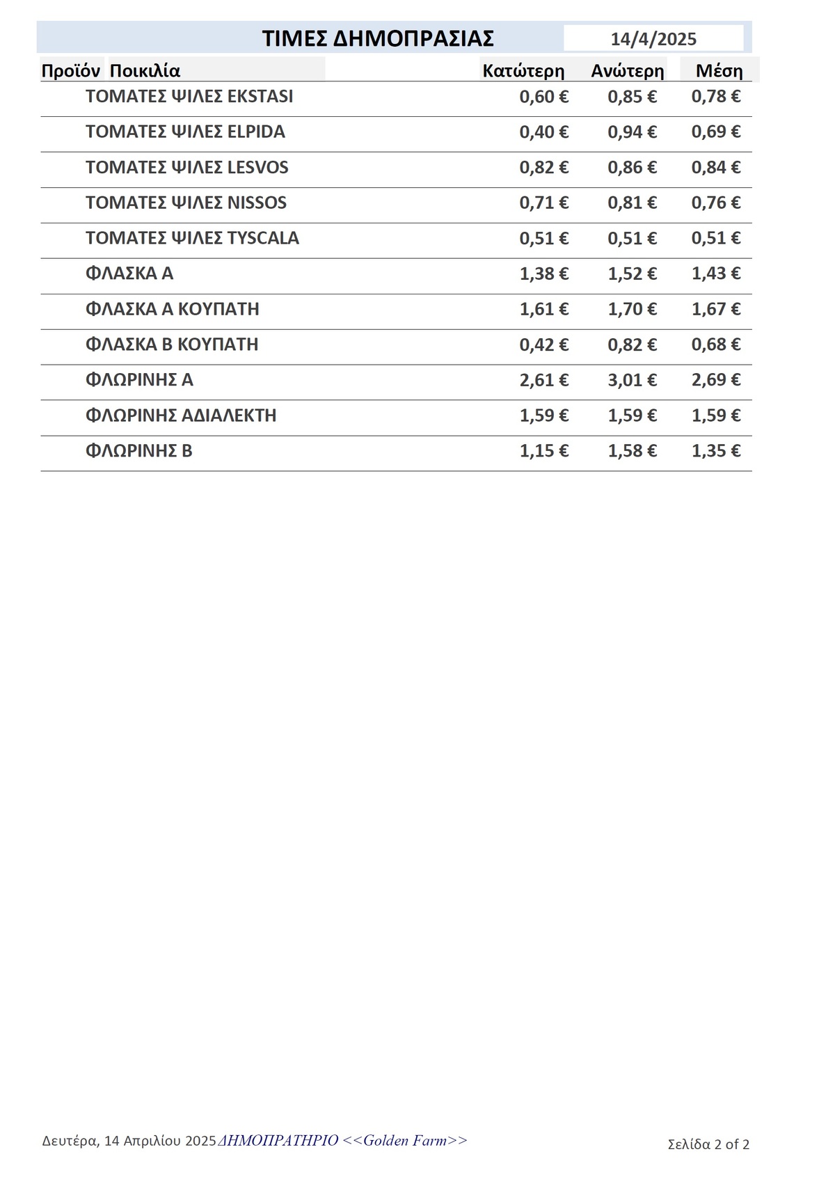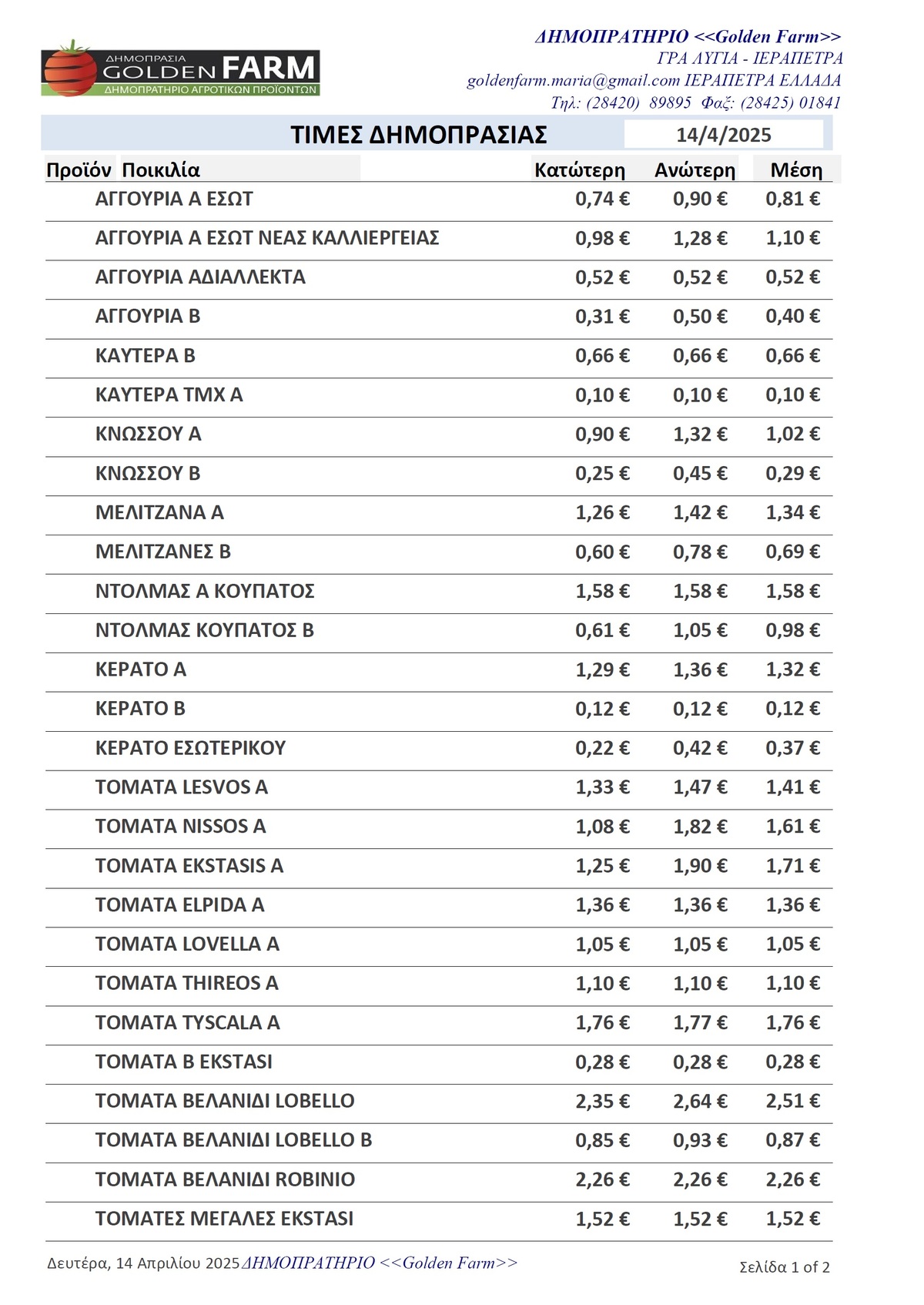 GOLDEN FARM |Τιμές Αγροτικών Προϊόντων 14.04.2025 ΤΙΜΕΣ 4:49 μ.μ. - Δευτέρα 14 Απριλίου 2025 04:04 μ.μ. - Δευ, 14/49/2025 ΙΕΡΑΠΕΤΡΑ, ΤΙΜΕΣ ΑΓΡΟΤΙΚΩΝ ΠΡΟΙΟΝΤΩΝ , ΔΗΜΟΠΡΑΤΗΡΙΟ, ΚΗΠΕΥΤΙΚΑ , GOLDEN FARM Δείτε τις σημερινές τιμές του δημοπρατηρίου