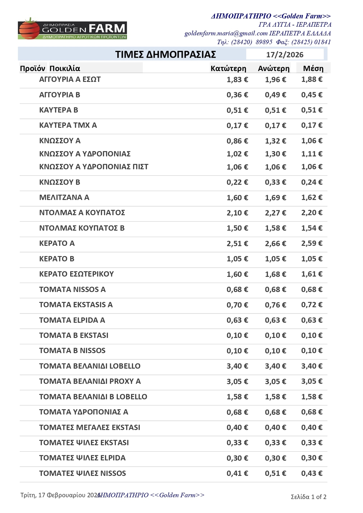 GOLDEN FARM |Τιμές Αγροτικών Προϊόντων 17.02.2026 ΤΙΜΕΣ 1:57 μ.μ. - Τρίτη 17 Φεβρουαρίου 2026 01:02 μ.μ. - Τρί, 17/57/2026 ΙΕΡΑΠΕΤΡΑ, ΤΙΜΕΣ ΑΓΡΟΤΙΚΩΝ ΠΡΟΙΟΝΤΩΝ , ΔΗΜΟΠΡΑΤΗΡΙΟ, ΚΗΠΕΥΤΙΚΑ , GOLDEN FARM Δείτε τις σημερινές τιμές του δημοπρατηρίου