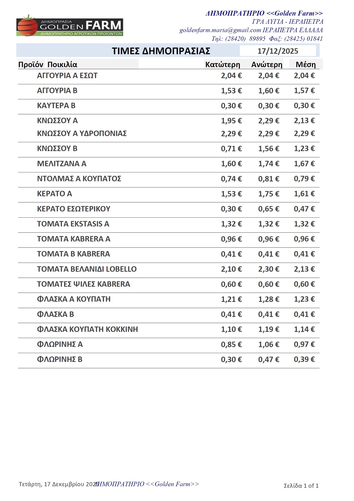 GOLDEN FARM |Τιμές Αγροτικών Προϊόντων 17.12.2025 ΤΙΜΕΣ 4:44 μ.μ. - Τετάρτη, 17 Δεκεμβρίου 2025 04:12 μ.μ. - Τετ, 17/44/2025 ΙΕΡΑΠΕΤΡΑ, ΔΗΜΟΠΡΑΤΗΡΙΟ, ΚΗΠΕΥΤΙΚΑ , GOLDEN FARM Δείτε τις σημερινές τιμές του δημοπρατηρίου