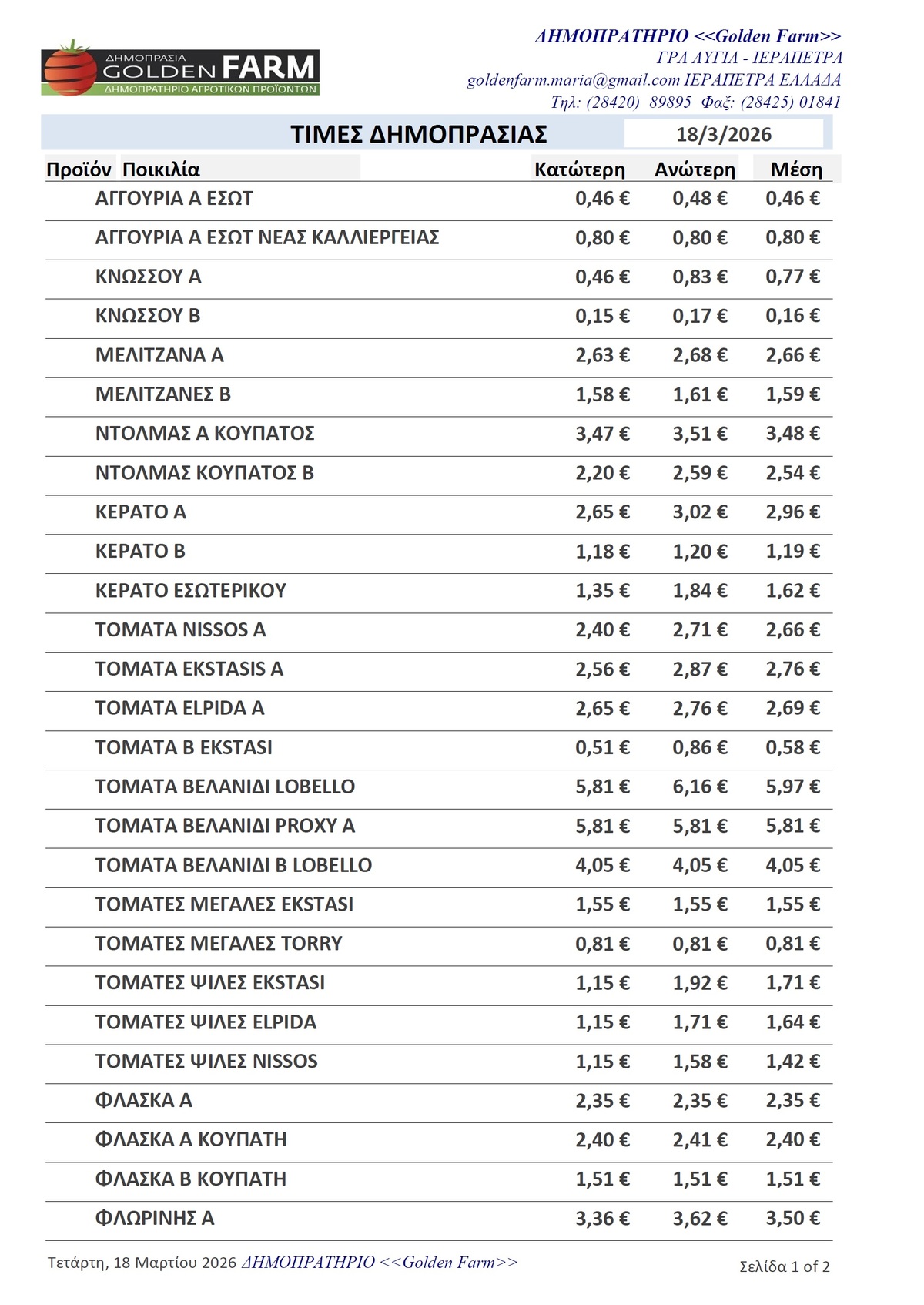 GOLDEN FARM |Τιμές Αγροτικών Προϊόντων 18.03.2026 ΤΙΜΕΣ 3:27 μ.μ. - Τετάρτη 18 Μαρτίου 2026 03:03 μ.μ. - Τετ, 18/27/2026 ΙΕΡΑΠΕΤΡΑ, ΤΙΜΕΣ ΑΓΡΟΤΙΚΩΝ ΠΡΟΙΟΝΤΩΝ , ΔΗΜΟΠΡΑΤΗΡΙΟ, ΚΗΠΕΥΤΙΚΑ , GOLDEN FARM Δείτε τις σημερινές τιμές του δημοπρατηρίου