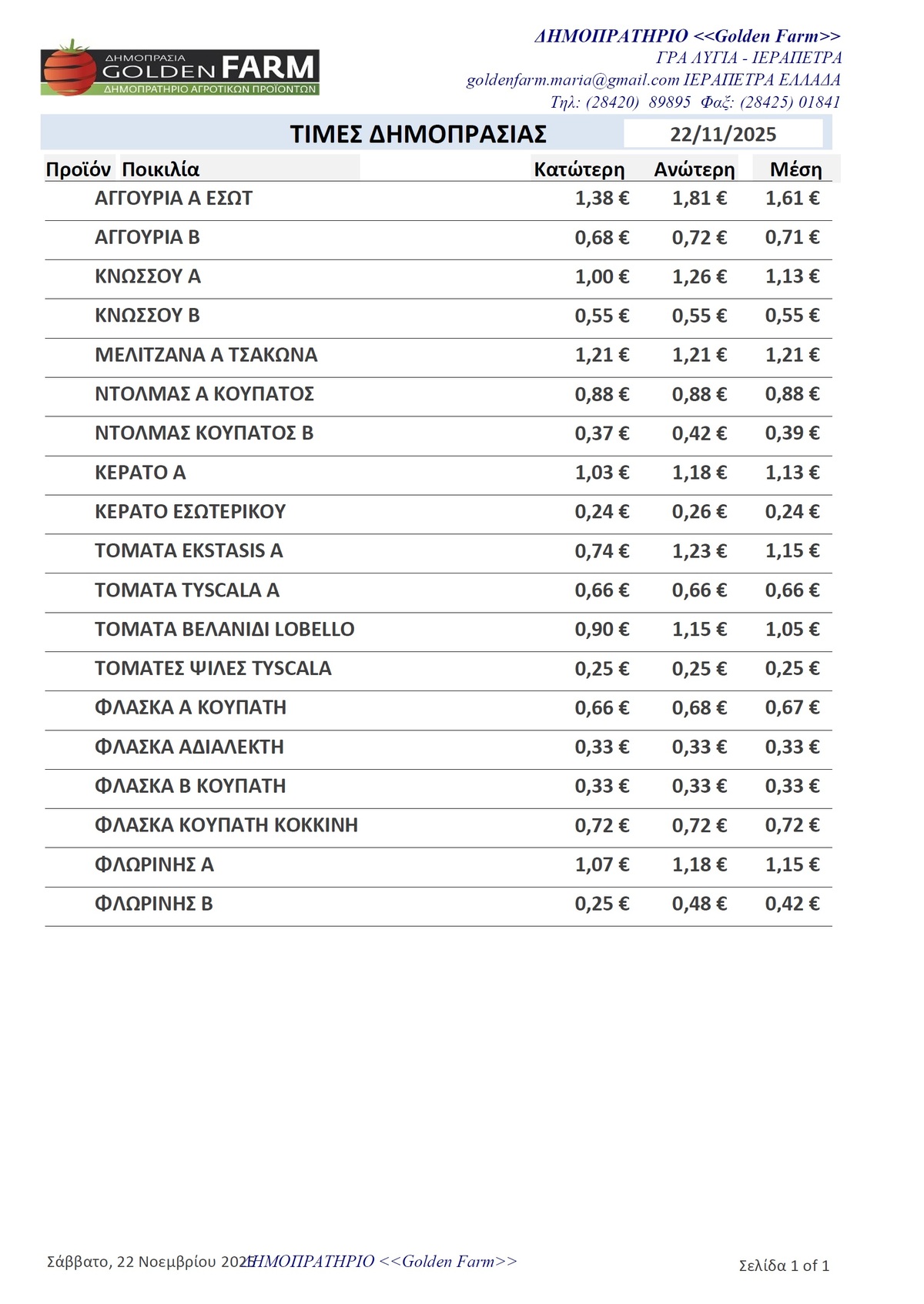 GOLDEN FARM |Τιμές Αγροτικών Προϊόντων 22.11.2025 ΤΙΜΕΣ 5:12 μ.μ. - Σάββατο, 22 Νοεμβρίου 2025 05:11 μ.μ. - Σάβ, 22/12/2025 ΙΕΡΑΠΕΤΡΑ , ΤΙΜΕΣ ΑΓΡΟΤΙΚΩΝ ΠΡΟΙΟΝΤΩΝ , ΔΗΜΟΠΡΑΤΗΡΙΟ, ΚΗΠΕΥΤΙΚΑ , GOLDEN FARM Δείτε τις σημερινές τιμές του δημοπρατηρίου