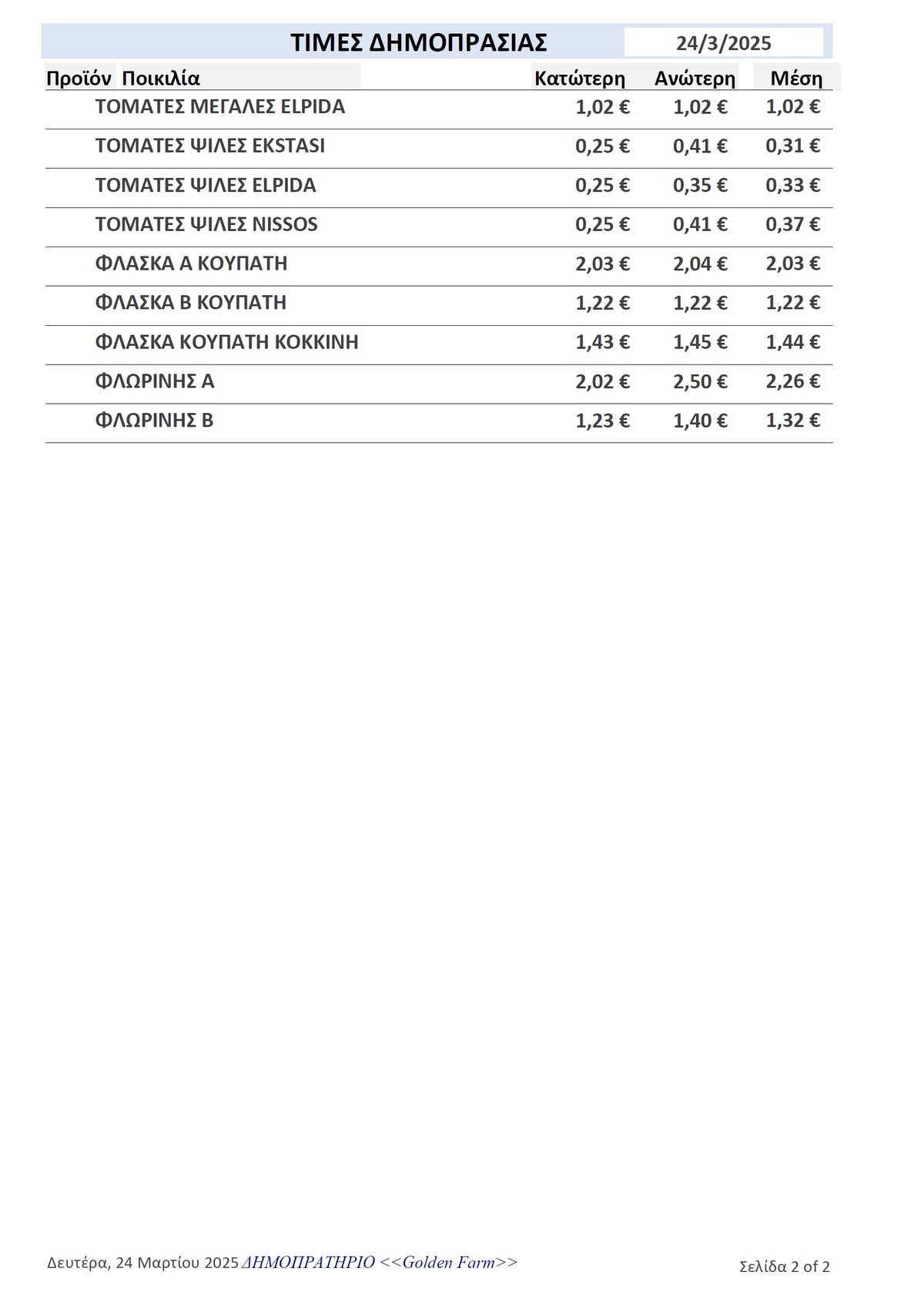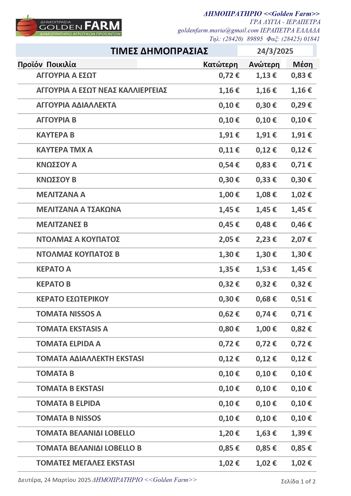 GOLDEN FARM |Τιμές Αγροτικών Προϊόντων 24.03.2025 ΤΙΜΕΣ 3:57 μ.μ. - Δευτέρα, 24 Μαρτίου 2025 03:03 μ.μ. - Δευ, 24/57/2025 ΙΕΡΑΠΕΤΡΑ, ΤΙΜΕΣ ΑΓΡΟΤΙΚΩΝ ΠΡΟΙΟΝΤΩΝ , ΔΗΜΟΠΡΑΤΗΡΙΟ, ΚΗΠΕΥΤΙΚΑ , GOLDEN FARM Δείτε τις σημερινές τιμές του δημοπρατηρίου