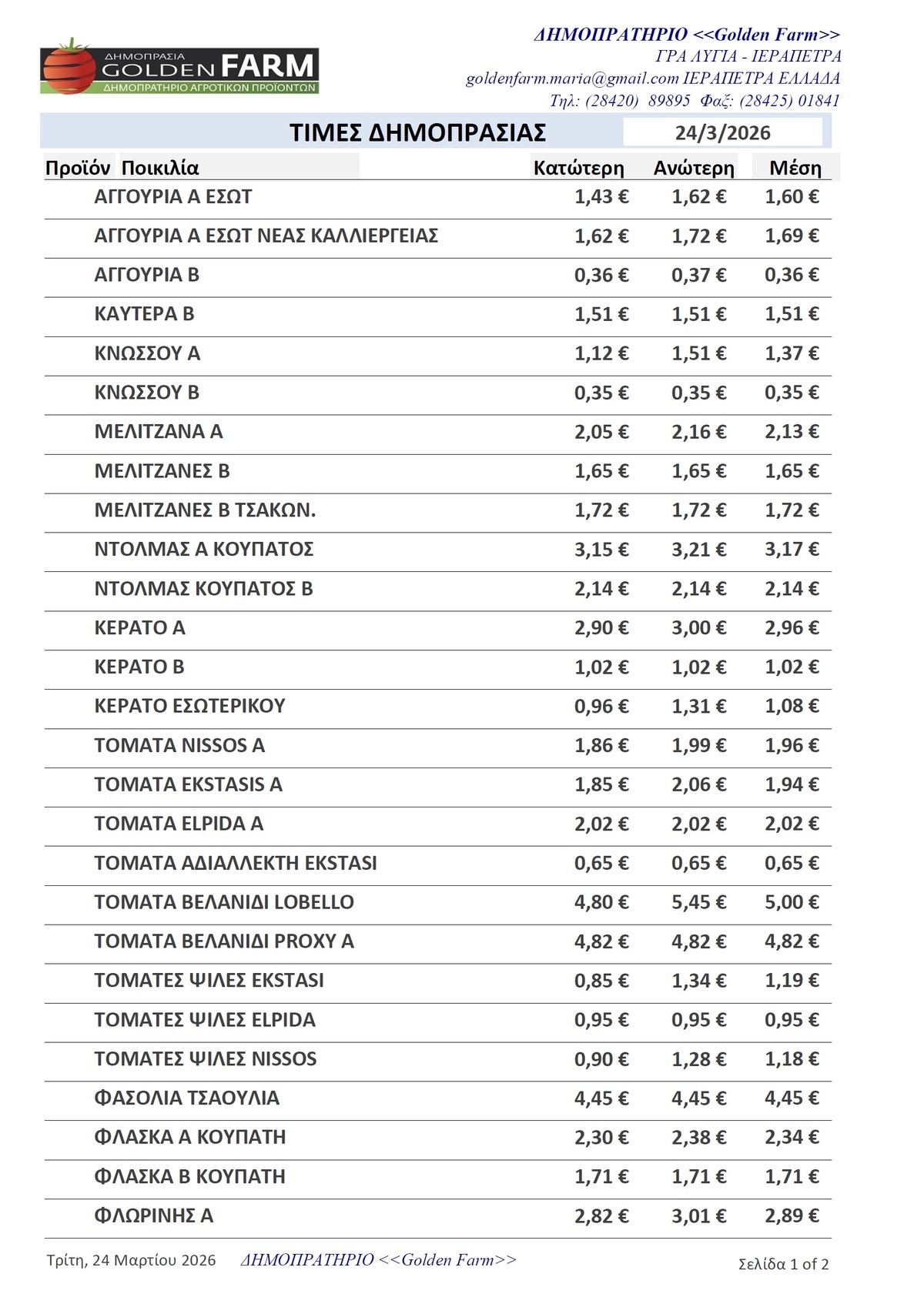 GOLDEN FARM |Τιμές Αγροτικών Προϊόντων 24.03.2026 ΤΙΜΕΣ 2:17 μ.μ. - Τρίτη 24 Μαρτίου 2026 02:03 μ.μ. - Τρί, 24/17/2026 ΙΕΡΑΠΕΤΡΑ, ΤΙΜΕΣ ΑΓΡΟΤΙΚΩΝ ΠΡΟΙΟΝΤΩΝ , ΔΗΜΟΠΡΑΤΗΡΙΟ, ΚΗΠΕΥΤΙΚΑ , GOLDEN FARM Δείτε τις σημερινές τιμές του δημοπρατηρίου