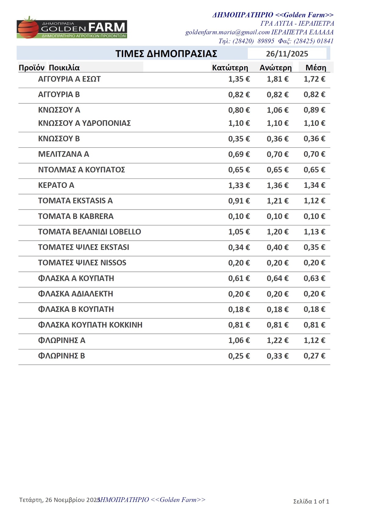 GOLDEN FARM |Τιμές Αγροτικών Προϊόντων 26.11.2025 ΤΙΜΕΣ 2:24 μ.μ. - Τετάρτη, 26 Νοεμβρίου 2025 02:11 μ.μ. - Τετ, 26/24/2025 ΙΕΡΑΠΕΤΡΑ, ΤΙΜΕΣ ΑΓΡΟΤΙΚΩΝ ΠΡΟΙΟΝΤΩΝ , ΔΗΜΟΠΡΑΤΗΡΙΟ, ΚΗΠΕΥΤΙΚΑ , GOLDEN FARM Δείτε τις σημερινές τιμές του δημοπρατηρίου