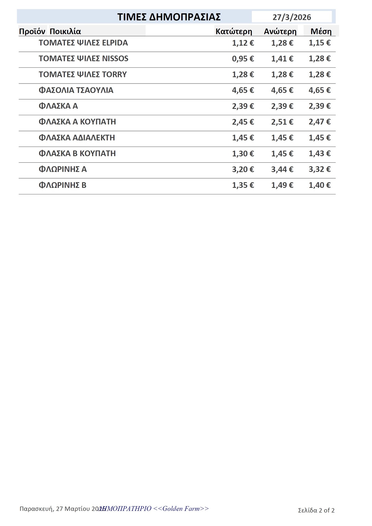 GOLDEN FARM |Τιμές Αγροτικών Προϊόντων 27.03.2026 ΤΙΜΕΣ 3:36 μ.μ. - Παρασκευή 27 Μαρτίου 2026 03:03 μ.μ. - Παρ, 27/36/2026 ΙΕΡΑΠΕΤΡΑ, ΤΙΜΕΣ ΑΓΡΟΤΙΚΩΝ ΠΡΟΙΟΝΤΩΝ , ΔΗΜΟΠΡΑΤΗΡΙΟ, ΚΗΠΕΥΤΙΚΑ , GOLDEN FARM Δείτε τις σημερινές τιμές του δημοπρατηρίου